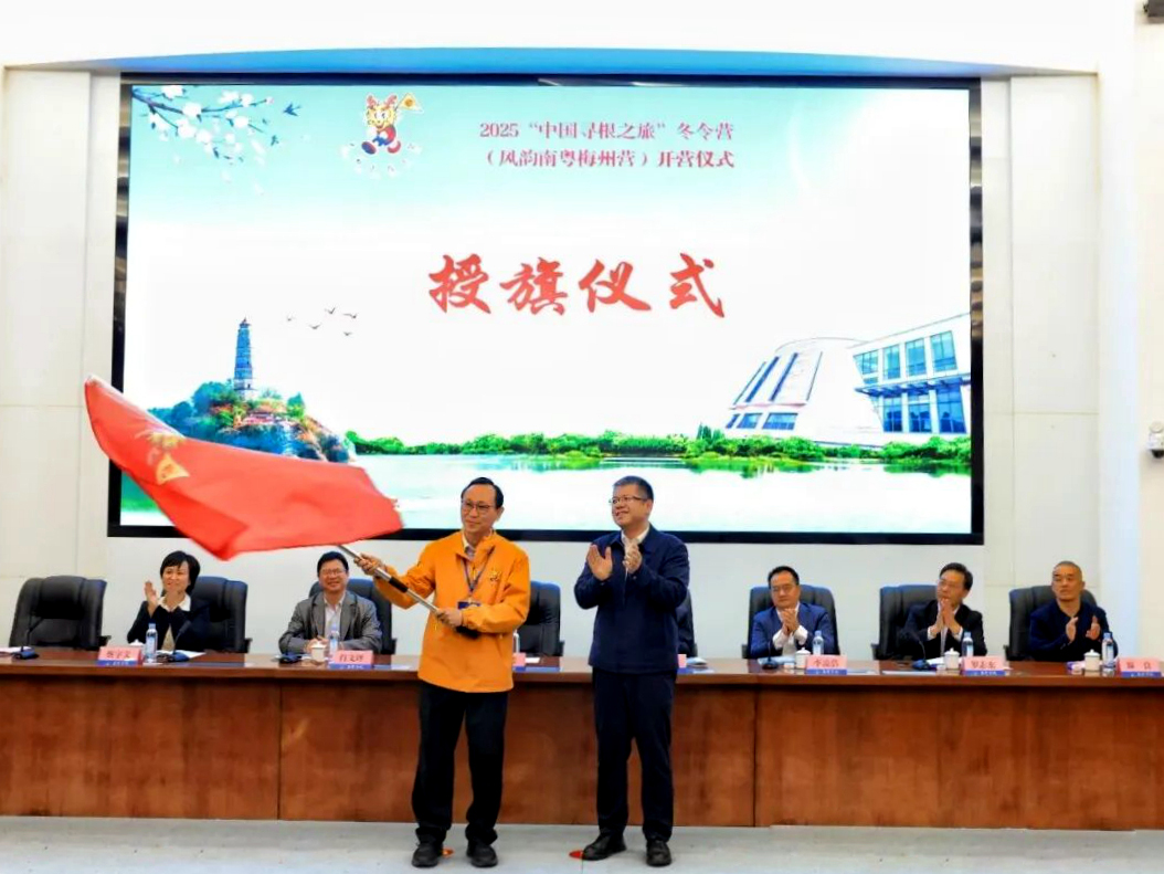 仪式现场:乡音乡情暖寒冬 梅州市委常委、统战部部长崔毅,嘉应学院副校长罗嘉文等嘉宾共同启动冬令营。崔毅在致辞中表示,本次活动以“探寻华夏根脉,传承中华文化,感受广东风采”为主题,希望营员成为中外友好往来的文化使者。现场,崔毅向营长黄观友授旗,象征寻根之旅正式启航。