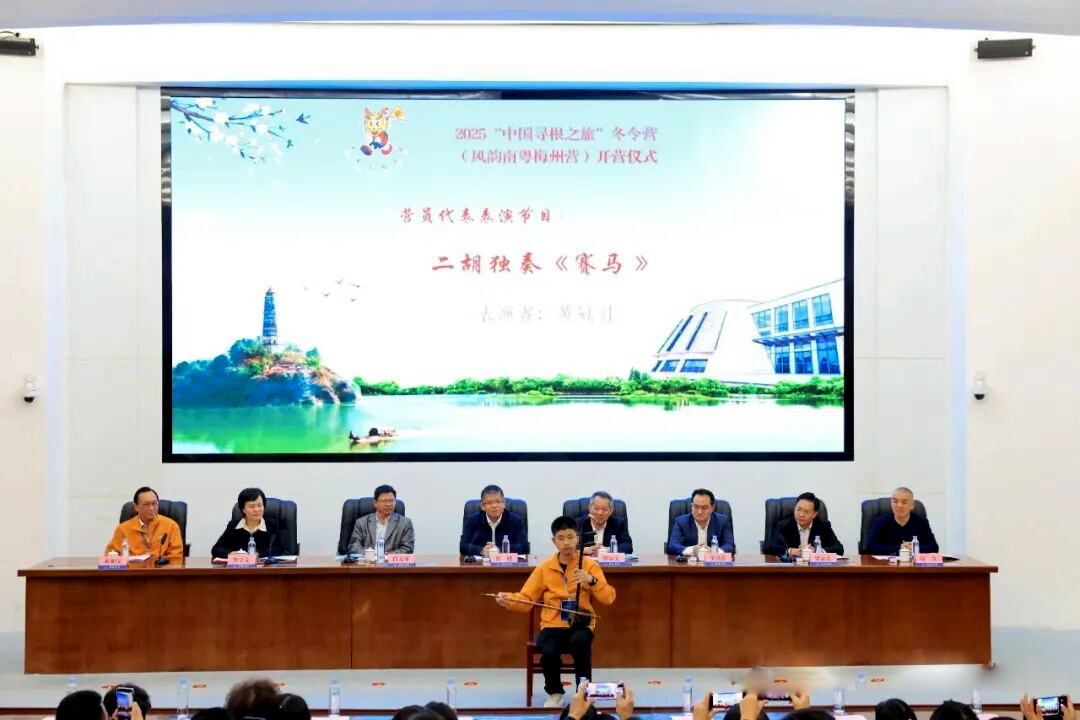 营员风采:才艺展演显传承 印尼营员邓愉静作为代表发言,表达对客家文化的向往;马来西亚少年黄冠羽以激昂的二胡曲《赛马》惊艳全场,展现海外客属后裔的艺术修养。