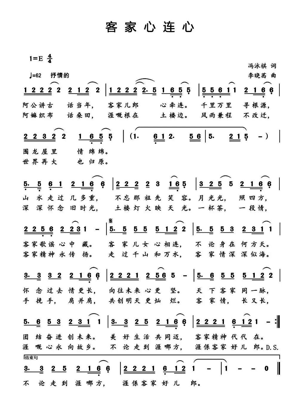 一曲双声,刚柔并济的客家记忆 “阿公讲古话当年,千里跋涉寻根源。”歌曲开篇即以男性视角,勾勒出客家人千年迁徙的壮阔画卷。那是一个民族的行走史诗,是客裔儿郎代代相传的家族记忆。 而“阿嫲嫲织布话桑田”则以女性视角,描绘出土楼内外、勤耕细作的日常生活场景。这一刚一柔,一历史一日常,共同编织出客家人从漂泊到定居的完整精神图谱。 土楼灯火,照亮客裔心灵归途 “风雨兼程寻根源,那盏土楼灯火暖心田。”土楼在歌曲中已不仅是物理建筑,更是客家人的精神灯塔。无论行走多远,那盏灯火始终是客家人心中最温暖的归宿。 歌曲以E调舒缓节奏(J=62)娓娓道来,从“月光光,照四方”到“客家歌谣心中藏”的自然过渡,仿佛将古老童谣与现代情感完美融合。既有对“旧时光”的深切怀念,也有对“共创明天”的坚定向往。