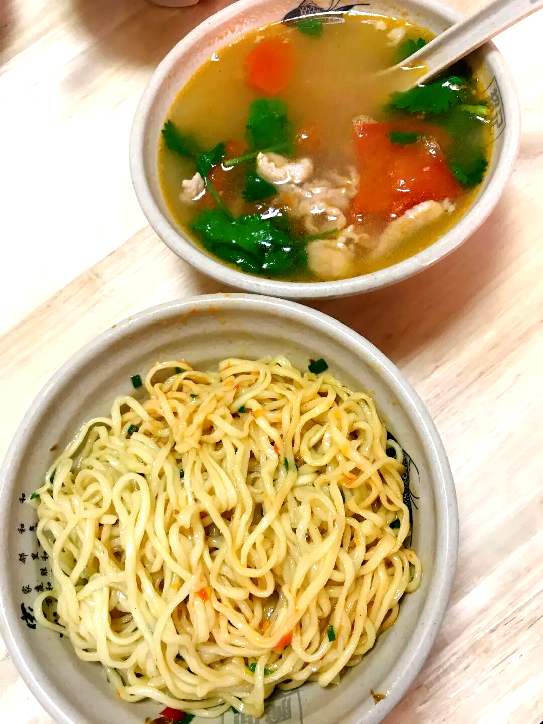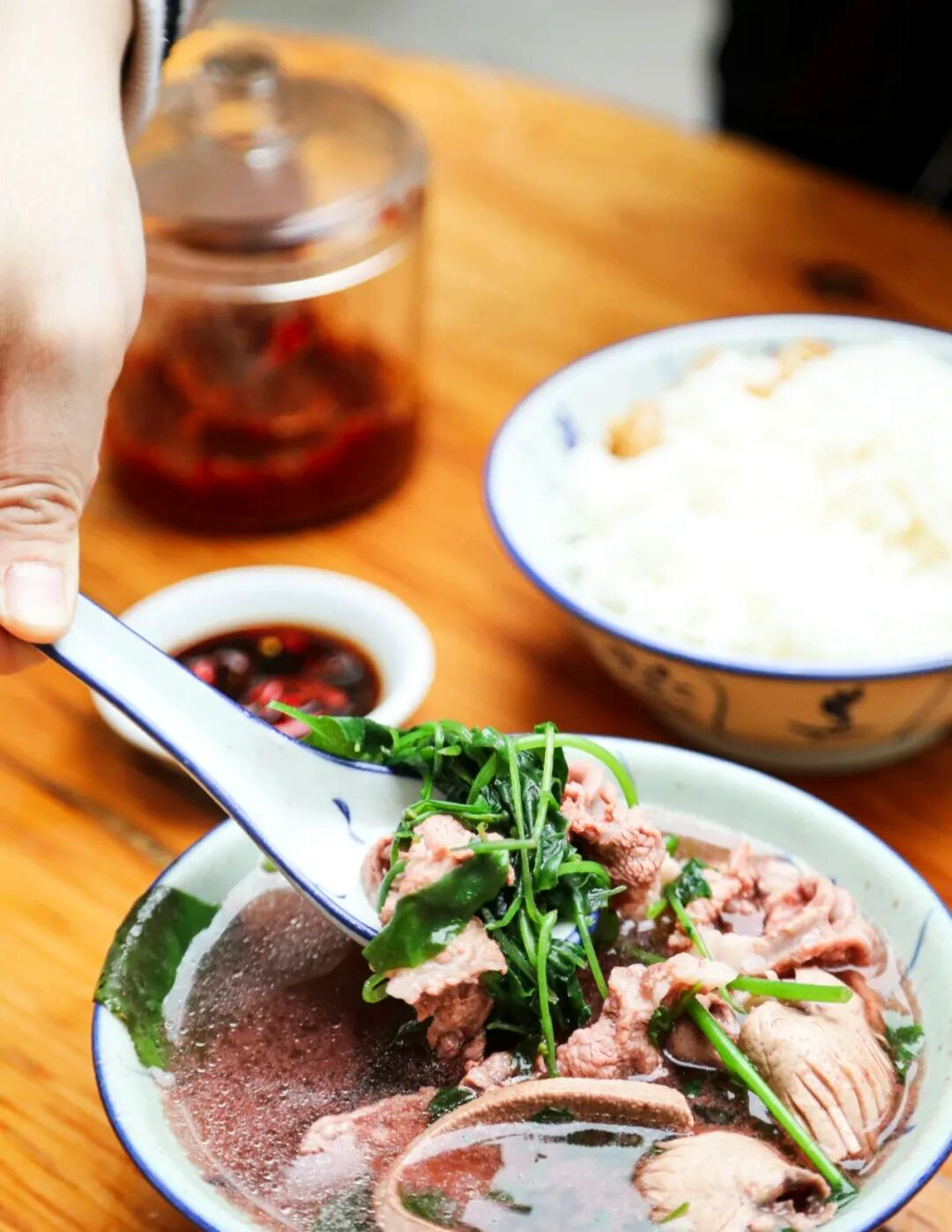 灵魂伴侣:藏着科举寓意的三及第汤 在客家人心中,一碗腌面断不能孤零零下肚,必须搭配一碗热汤才算圆满,而其中最具代表性的便是蕉岭的“三及第汤”。 这碗汤的名字透着浓浓的文墨气,取自科举制度中“连中三元,进士及第”的吉兆。汤里的三样荤食——猪瘦肉、猪肝、猪粉肠,按“由贱而贵”的顺序搭配,暗喻解元、会元、状元,藏着客家人“耕读传家”的深切期盼。 三及第汤的做法讲究新鲜,猪瘦肉、猪肝、猪粉肠现切现煮,沸水汆熟后,加入一把嫩绿的枸杞叶,清汤中浮着荤腥与青翠,口感清鲜不腻,与油润的腌面搭配,刚好中和油腻,相得益彰。