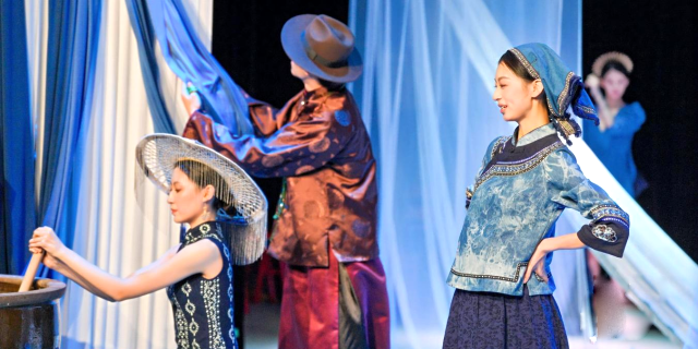 侨批叙事:从家书到舞台的情感升华 剧本以南洋华侨陈经纬替母寻根为主线,通过博物馆偶遇的侨批串联起两代人的命运。母亲为家计远赴南洋的挣扎、对故土的刻骨思念,在演员的诵读中层层剥开。创作团队赴梅州松口古镇实地采风,将侨批文献中的烟火细节转化为戏剧冲突,让"集体家书"成为穿透时空的情感载体。 非遗活化:传统技艺的当代艺术转译 客家婚礼仪式的拜堂场景还原、蓝染纹样融入服装设计、锡器工艺点缀舞台道具——非遗元素不再是静态展示,而是与现代舞蹈、声光技术深度融合。山歌旋律经现代编曲后更富感染力,年轻演员用肢体语言演绎蓝染的浸染韵律,实现"老传统"与"新表达"的共生。