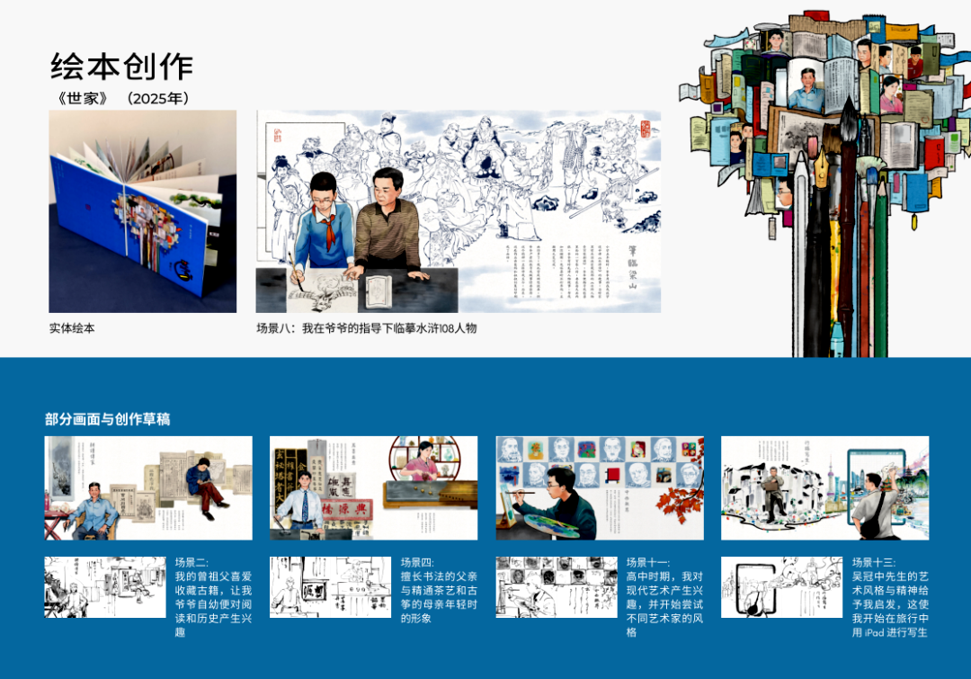 策展缘起:家学底蕴与数字语言的跨界融合 展览策展人何世炜出身艺术世家,其父何柏俊的彩书作品是客家汉字艺术的代表。何世炜结合本科数码艺术专业与硕士策展研究背景,将父亲的传统彩书进行数字转译,通过算法生成、动态笔触等手法,让书法在虚拟空间中“活”起来。 四大模块:从文脉传承到公共参与 1.世家传承 以数字绘本《世家》为主线,通过曾祖父收藏古籍、祖父启蒙阅读等场景,呈现家族文脉对何世炜美学观的影响。