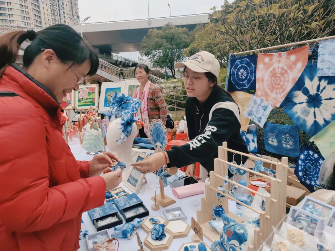 衍纸区中,细纸条在青年创作者手中经卷、捏、拼、贴,变身成以山茶花为灵感的《岩城衍芳·山茶缀》胸针等精致饰品,将闽西春日气韵藏于襟间。扎染区的蓝白围巾、布包自带“盲盒惊喜”,缝绞法呈现的湖水肌理与捆扎法勾勒的山峦轮廓,在《湖山揽月》等作品中尽显东方美学。