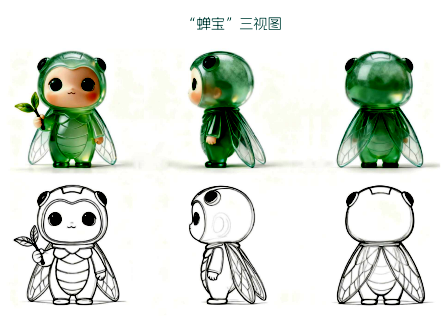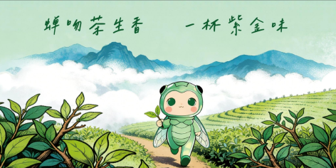 “蝉宝”:茶山小精灵的生态告白 设计团队以叮咬茶叶形成独特花果蜜香的小绿叶蝉为原型,精准还原其头部复眼、灵动翅膀及腹部横纹。“蝉宝”被赋予“茶山小精灵”的角色,成为紫金蝉茶的官方形象代言人。目前,“蝉宝”已衍生出“蝉妹”形象及多款表情、动态造型。