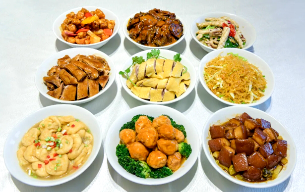 二、菜品精髓:家常食材里的客家风味 1.食材底色:朴实无华,尽显风土 客家九大碗的核心是 “接地气”,没有名贵食材,全靠本地种养的禽畜与时令蔬菜撑场。主料以鸡肉、猪(鸭、鹅)肉等肉菜为主,既符合客家人劳作后补充体力的需求,也彰显了 “待客要丰” 的诚意;辅料则随季节更迭,青菜、豆腐、粉丝等信手拈来,最大程度保留食材本味。 2.经典菜式:藏着记忆的家常味道 虽无固定菜单,但有几道菜几乎是客家九大碗的 “常驻嘉宾”,每一道都刻着客家风味的烙印: 白切鸡:清水煮制,蘸姜葱酱油,皮脆肉嫩,是客家宴席 “无鸡不成宴” 的标配; 黄焖猪肉:肥瘦相间的猪肉慢炖入味,软糯不腻,盛满客家人对富足生活的向往; 卤鹅(鸭):老卤慢浸,咸香入骨,是梅州本地极具代表性的荤菜; 还有发财蚝豉(寓意 “发财好市”)、虾米粉丝、炒干鱿、糖醋咕噜肉、大酥丸、油豆腐等,肉菜为主、荤素搭配,每一口都是家常的踏实感。