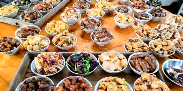 三、宴席场景:围屋里的热闹团圆 客家人热情好客,“九大碗” 便是这份热情的最佳载体。在农村地区,办宴席时,主人家会在自家农家院或老围屋里,摆起四方的 “八仙桌”,乡亲邻里、亲朋好友围坐一堂,桌上九大碗热气腾腾,席间推杯换盏、欢声笑语,场面热闹非凡。 烹饪九大碗是件耗费心力的事,要满足几十上百人的口味,往往需要提前几天筹备,邻里们主动搭手帮忙,切菜、炖煮、摆盘,分工协作间,不仅是筹备宴席,更是客家 “邻里互助” 文化的体现。如今想品尝最地道的九大碗,大多需要提前预约,才能赶上这份专属的烟火盛宴。