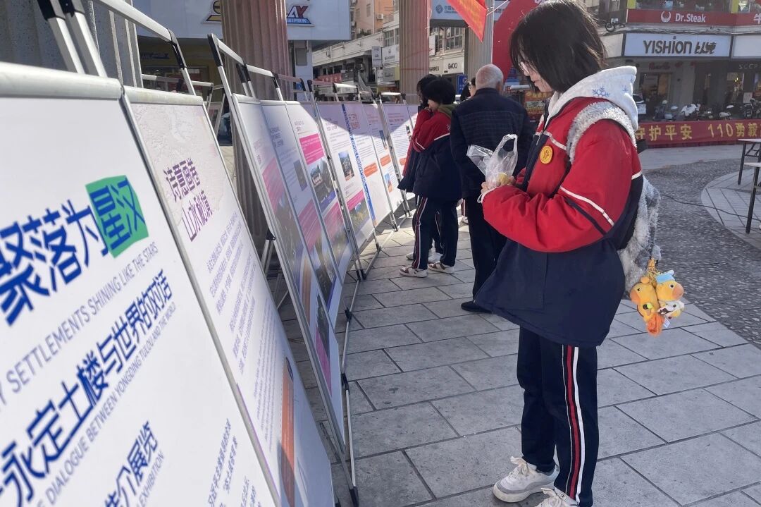 不少在广场休憩的老人和学生纷纷加入观展行列,聆听土楼与世界各地建筑跨越山海的对话故事。这种直观的比较方式,让观众对土楼的世界遗产价值有了更深刻的理解。