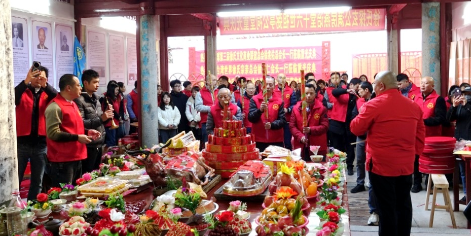 祭祀大典上,主祭人按古制宣读祭文,敬献三牲、酒礼,宗亲代表依次上香跪拜,庄重的仪式感传递着客家先民 “慎终追远” 的文化基因。现场还设置贺匾迎送环节,各地宗亲带来的 “祖德流芳”“忠孝传家” 等匾额,被一一悬挂于堂内,见证宗族联结。 此外,书画创作、写春联等文化活动同步开展,书法家挥毫泼墨,将客家家训、吉祥话语融入笔墨,为庆典增添了浓郁的文化气息。