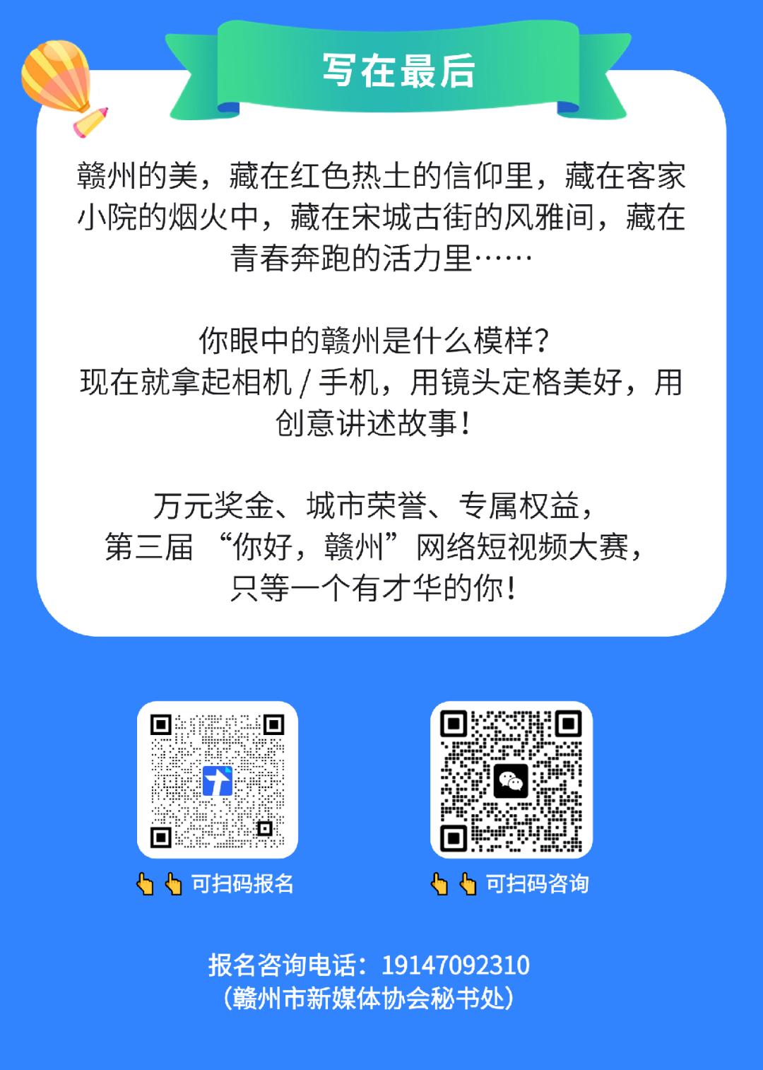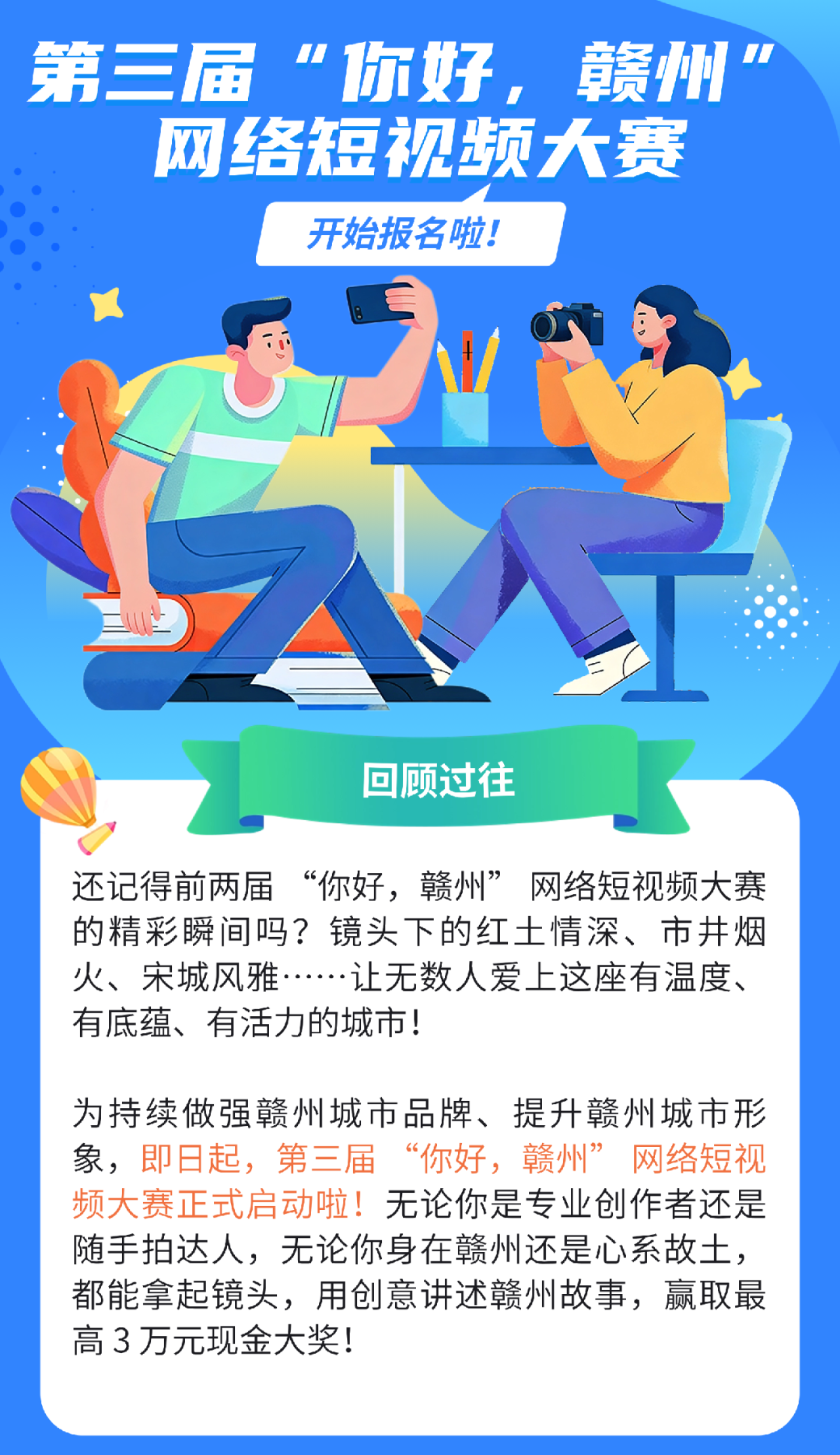 客家网 赣州讯 近日,第三届"你好,赣州"网络短视频大赛正式启动。大赛由赣州市委统战部、市委网信办联合主办,面向全网征集展现赣州红色文化、客家风情、宋城风雅的创意短视频,最高奖项奖金达3万元。
