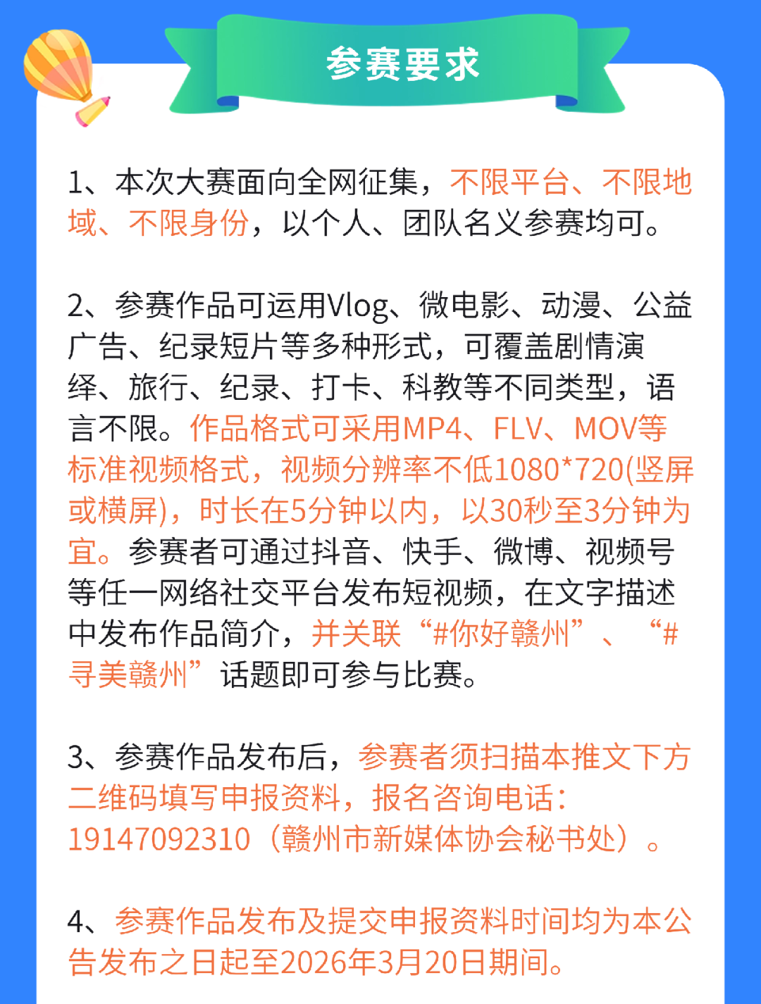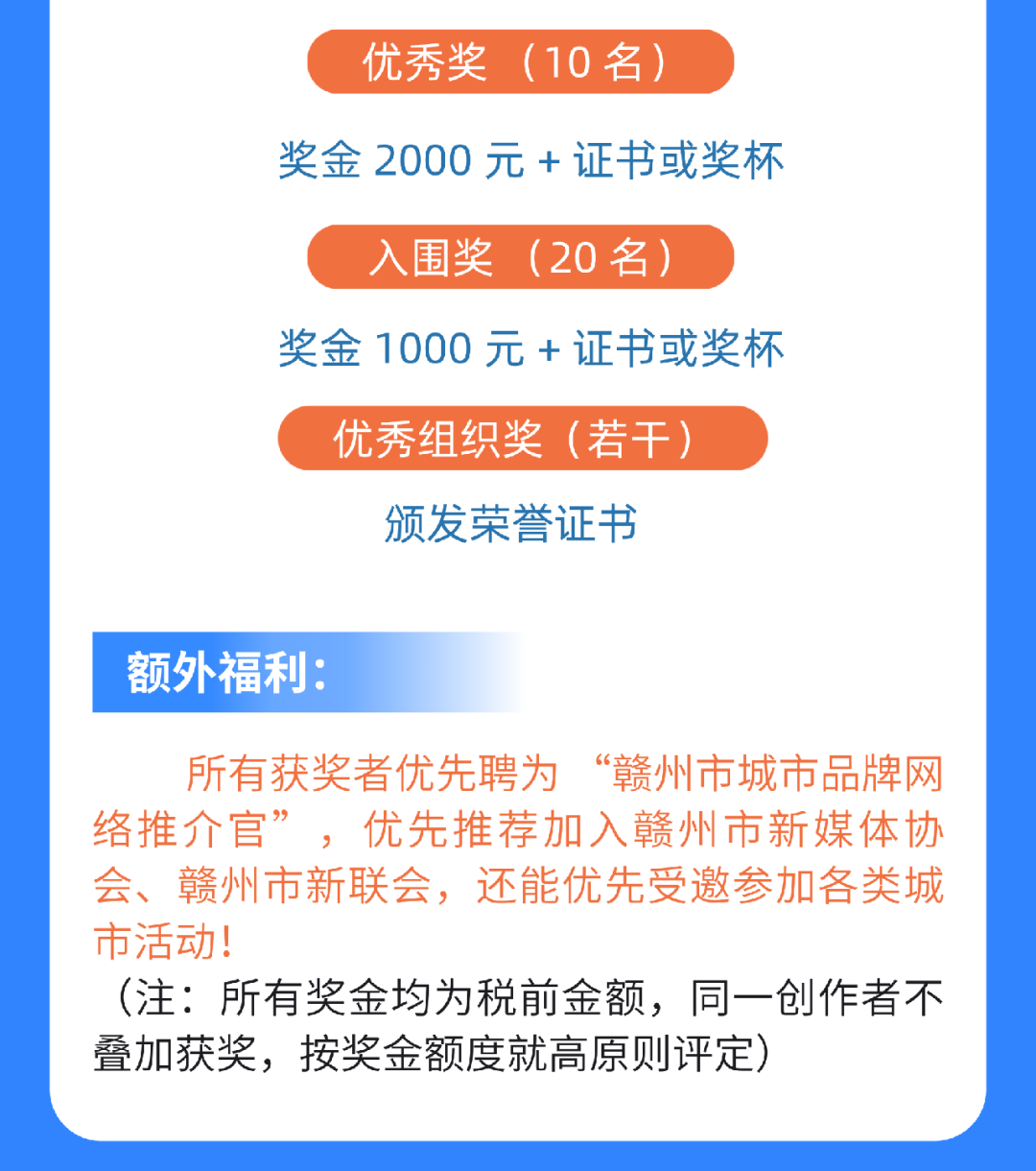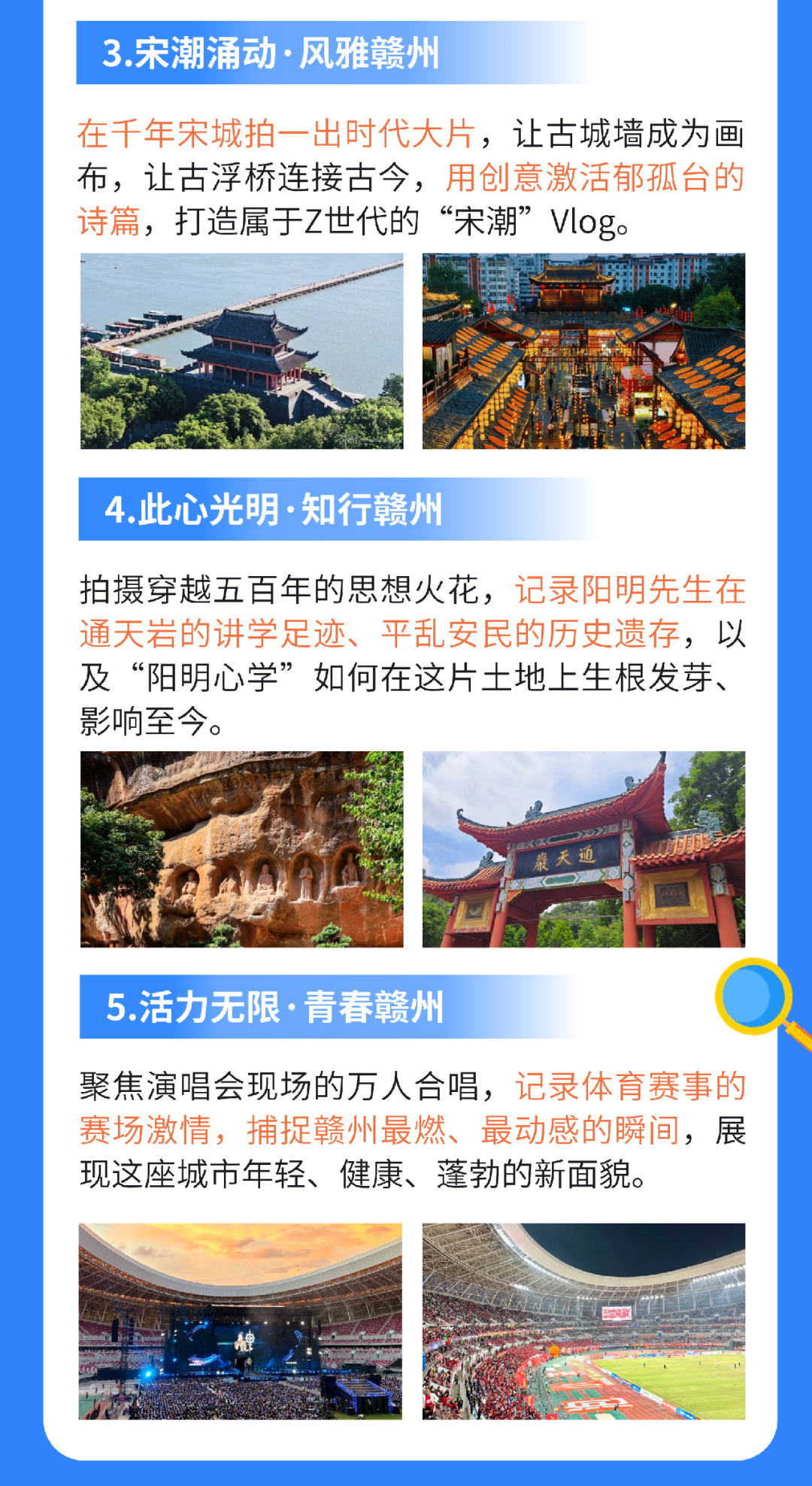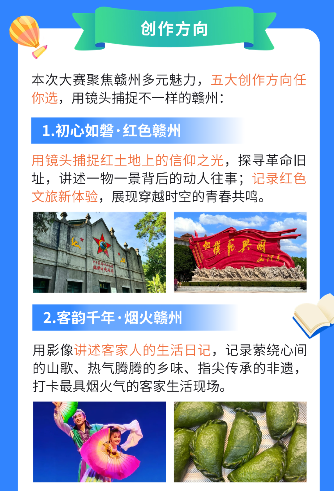 五大主题展现赣州多元魅力 本届大赛设置五个创作方向:"红色赣州"探寻革命旧址、"烟火赣州"记录客家生活、"风雅赣州"激活宋城文化、"知行赣州"传承阳明心学、"青春赣州"捕捉城市活力。参赛者可通过抖音、快手等平台发布作品,并关联"#你好赣州"话题即可参与。 丰厚奖励培育创作人才 大赛设立多个奖项,一等奖奖金3万元,二等奖1万元,三等奖5000元,另设最高人气奖、最具传播力奖等特色奖项。所有获奖者将优先聘为"赣州市城市品牌网络推介官",并获得加入新媒体协会等机会。 客家文化成为重点创作方向 "客韵千年·烟火赣州"作为五大创作方向之一,鼓励创作者用影像记录客家人的生活日常,展现客家山歌、传统美食、非遗技艺等文化特色,让客家文化通过新媒体平台得到更广泛传播。