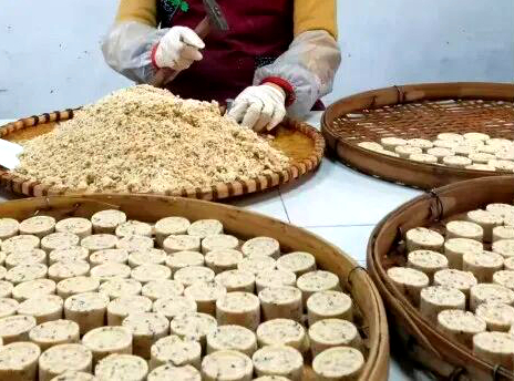 翁源客家米饼:方寸圆饼里的百年香甜传承 (一)舌尖上的客家风味:食材与工艺的坚守 翁源客家米饼是客家人刻在骨子里的味觉记忆,既是日常解馋的零食,也是节庆送礼的佳品,更是婚嫁喜事中的喜饼担当。其制作选用翁源本地油粘米、红衣小豆花生、芝麻与冰片糖,从食材到成品要历经10道严苛工序:选料、泡米晾米、柴火炒米、碎米成粉、炒香花生芝麻、捣碎花生、油拌米粉、混合配料、手工印饼、蒸制出锅,每一步都藏着老匠人的讲究。 洗米前需充分浸泡,才能彻底去除米尘与米衣;碎好的米粉要静置“回潮”,确保口感细腻;柴火慢炒的食材带着天然焦香,纯手工压制让米饼紧实不松散。最终成型的米饼直径约5厘米,圆润规整,表面印着“寿”“福”“囍”等吉祥纹样,一口下去,米香、花生香、芝麻香交织,甜而不腻,满口生津。 (二)百年流转:从饼坊林立到线上飘香 清朝末年,翁源饼食行业已独立成派,客家米饼开始外销;民国时期,当地饼铺声名鹊起,米饼成为热销特产。如今,这项技艺以家庭作坊、社区传授的方式代代相传,龙仙镇的山姑米饼坊、张氏米饼、三兴蒸米饼等饼坊,依旧坚守传统工艺。随着电商兴起,翁源客家米饼走出县域,通过线上平台让更多人尝到这份客家香甜。