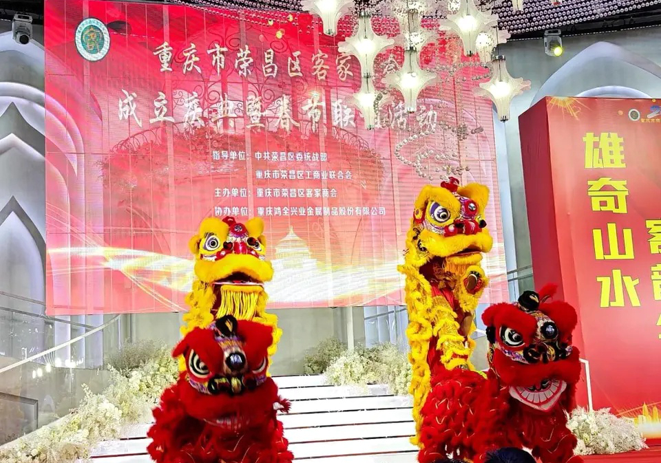 四海同心:商会启航的仪式感 庆典在舞狮表演中拉开序幕,雄狮腾跃寓意客家人敢闯敢拼的精神传承。现场通过暖场视频、嘉宾致辞、授牌仪式等环节,展现荣昌客家商会从2020年发起筹备到2024年10月正式获批的四年沉淀。商会已吸纳医疗、金融、制造、航空等多元领域会员企业,部分业务延伸至国际市场,成为连接成渝与全球客商的重要节点。