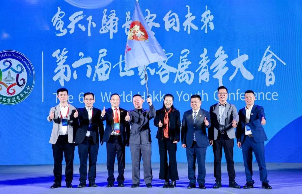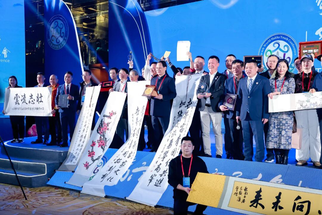 此次祭典既是对客家人“慎终追远”传统的践行,更是对“天下客属,同根同源”民族情感的生动诠释,彰显了新时代客属青年传承中华文脉的责任担当。 薪火相传:会旗交接,续写客青华章 大会闭幕式上,精彩环节接连上演。各客属社团代表赠送了来自全球各地的书画作品及纪念礼品,既展现了客家人崇文重教的传统,也体现了客属文化的多元发展。