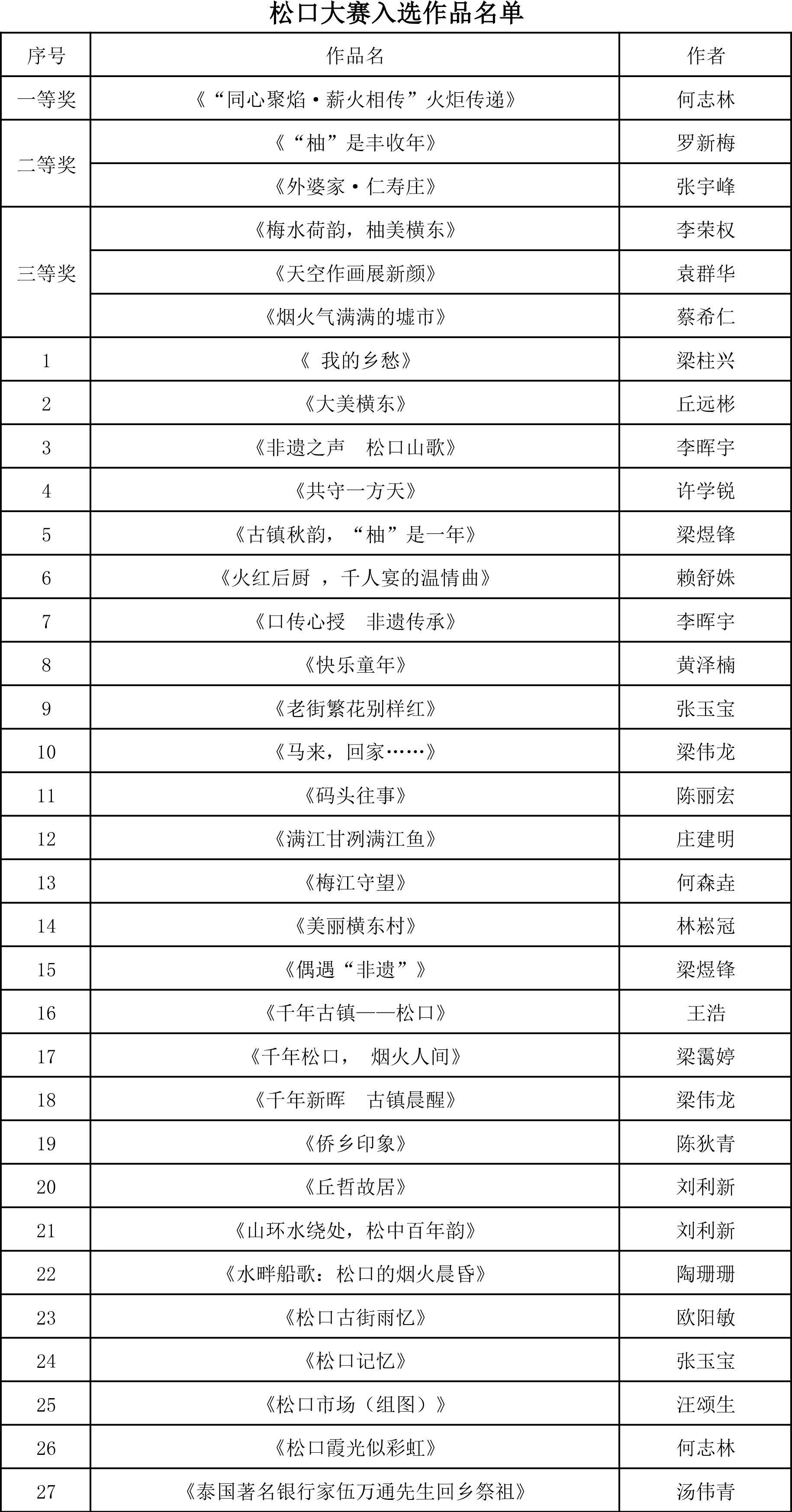二等奖:《外婆家·人寿庄》 摄影:张宇峰 获奖佳作:定格松口多元魅力 大赛奖项设置丰富,共评选出一等奖 1 名、二等奖 2 名、三等奖 3 名及优秀奖 100 名,20 条视频作品同步获奖。 一等奖作品《“同心聚焰・薪火相传” 火炬传递》(摄影:何志林),以震撼的画面捕捉了火炬传递的庄严瞬间,传递出客侨文化薪火相传的精神内核;二等奖《“柚” 是丰收年》(摄影:罗新梅)与《外婆家・仁寿庄》(摄影:张宇峰),分别聚焦松口特色产业丰收盛景与古村人文风貌,充满生活气息与乡愁韵味;三等奖《梅水荷韵,柚美横东》(摄影:李荣权)、《天空作画展新颜》(摄影:袁群华)、《烟火气满满的墟市》(摄影:蔡希仁),则从自然风光、城镇发展、民俗生活等角度,展现了松口的多元魅力。 优秀奖作品同样亮点纷呈,《非遗之声松口山歌》《泰国著名银行家伍万通先生回乡祭祖》《无人机运送柚子》等作品,既记录了客侨文化的传承与乡愁情怀,也展现了松口在产业发展、乡村振兴中的新变化,全方位、多角度呈现了 “千年松口,烟火人间” 的独特韵味。