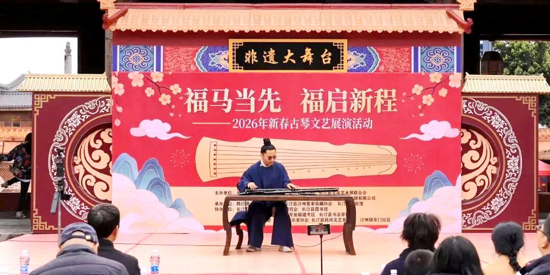客家网 长汀讯 琴音袅袅贺新春,福韵悠悠润汀城。2月7日下午,“福马当先 福启新程”2026年新春古琴文艺展演在龙岩长汀县文庙圆满落幕。这场以古琴非遗为核心、深度融合“福”文化的文化盛宴,为汀城的市民与游客带来了别样的新春体验,让中华优秀传统文化在客家大地焕发新活力。 本次展演由长汀县文化体育和旅游局、县总工会、县文学艺术界联合会等多部门联合主办,陈行清古法斫琴工作室等单位承办,县国家历史文化名城研究会等单位协办,以非遗为纽带、以新春为契机,将古琴的古韵雅韵与新年的福气年味完美相融,成为长汀县新春文化活动中的一抹亮色。