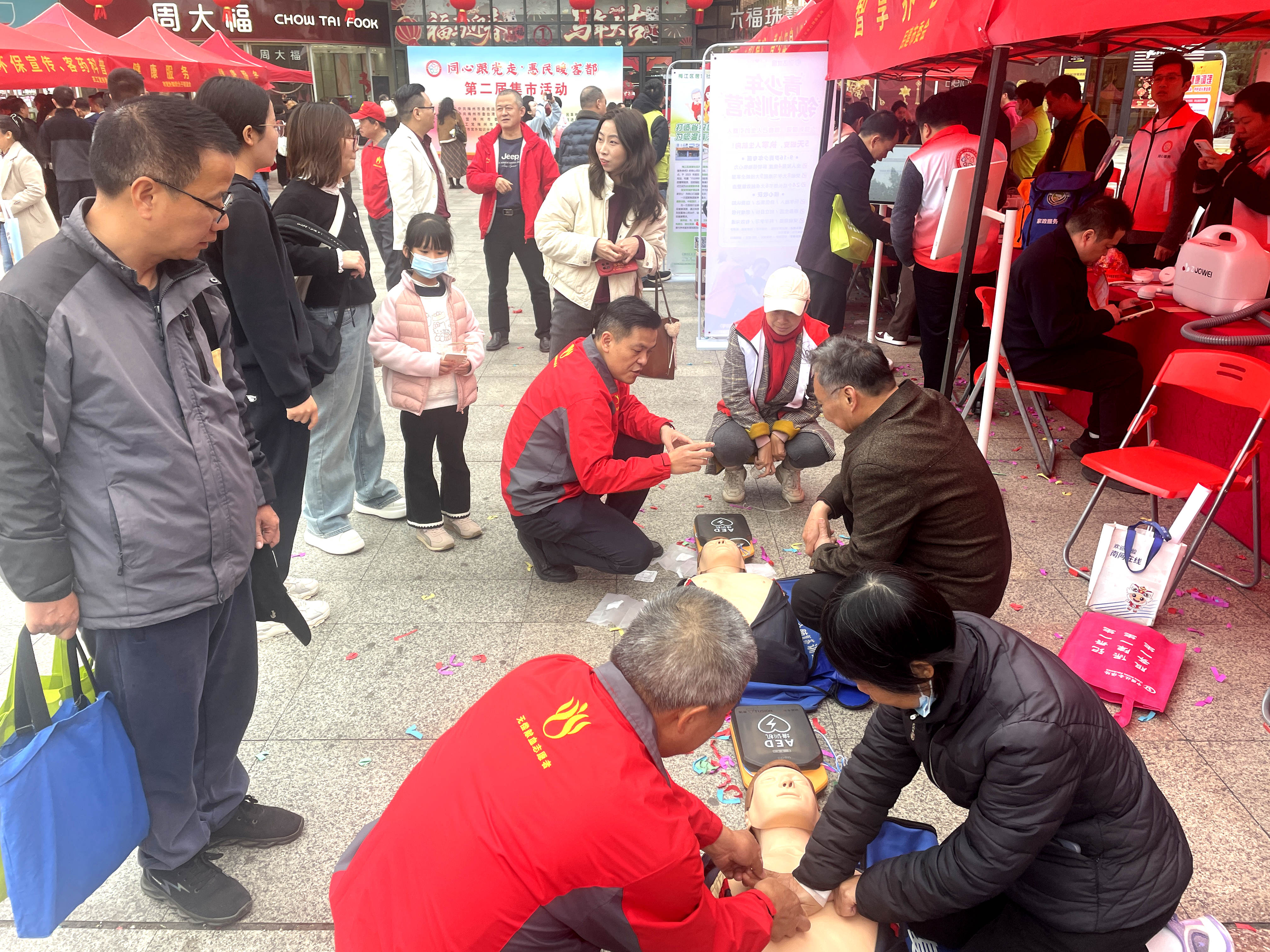 本次联合展位紧扣惠民主题,整合专业资源,开展心肺复苏(CPR+AED)、海姆立克急救法、创伤包扎等应急救护知识讲解与实操指导,志愿者们将专业的急救技能转化为通俗易懂的实操方法,让市民快速掌握守护生命的关键技巧;同时同步开展无偿献血公益宣传,通过发放宣传册、现场答疑等方式,呼吁更多健康适龄市民加入无偿献血队伍,用热血传递爱心与温暖。理论讲解+实操体验+公益科普的形式,让市民在逛集市的过程中,实现“一逛多学、一站受益”,现场咨询踊跃、互动热烈。