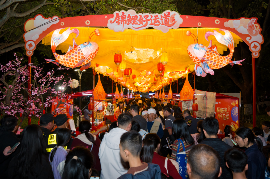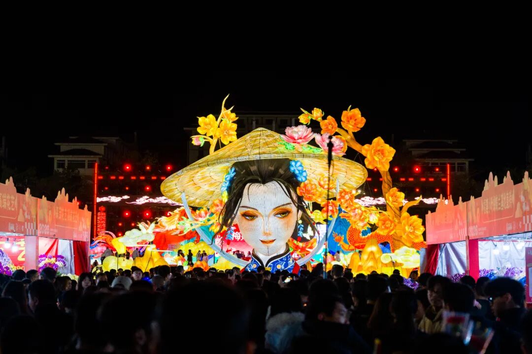 随着领导嘉宾共同按下启动键,全场观众手持迎春花灯同步点亮,“请到梅州过大年”七个大字在院士广场熠熠生辉,漫天灯火将现场化作欢乐海洋,也寓意着梅州新春文旅活动正式启幕。 灯市烟火融年味,客家风情沉浸式体验 启动仪式现场,新春灯会、春节圩市、迎春花市三大特色展区同步开放,让市民游客提前感受浓浓年味。千盏华灯在院士广场次第绽放,打造出融合客家文化与现代光影的视觉盛宴:“梅州女神”灯组温婉雅致,勾勒出客都独特风韵;“鲤鱼跃龙门”“龙马精神”“锦鲤通道”等特色灯组错落排布,满载着马年新春的美好祈福,步步皆景,成为市民游客打卡留念的热门点位。
