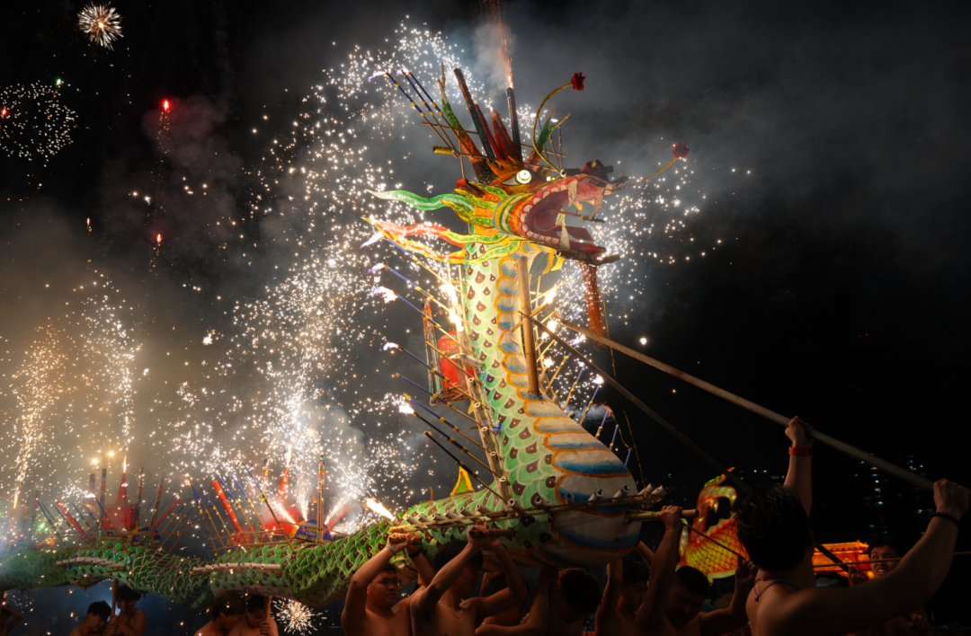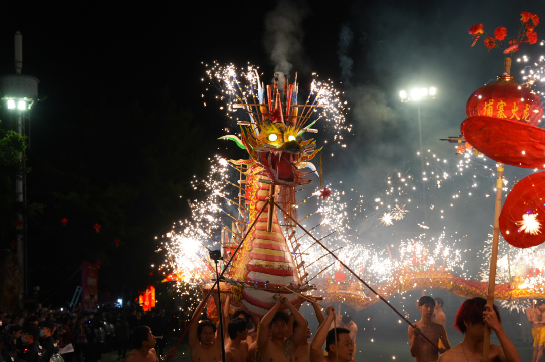 春节圩市中,近60家美食摊位烟火升腾,老字号客家娘酒香飘四溢,客家腌面、酿豆腐、盐焗鸡等地道美食一应俱全;非遗互动区里,客家手艺人现场展示技艺,千年匠心在指尖流转;创意文创、客家特产琳琅满目,让游客一站式购齐客家年味。迎春花市则春光烂漫,年桔、蝴蝶兰与各色年花争奇斗艳,市民游客驻足选购、互相道贺,欢声笑语与光影流转相融,一幅喜庆祥和的客都新春画卷徐徐展开。 非遗科技双赋能,火龙烟花燃动小年夜 本次启动仪式的高光时刻,当属国家级非遗“烧火龙”的精彩上演。两条火龙在夜色中霸气登场,各由5位“金马福使”共同点燃,火龙携烈焰穿梭腾跃,火与光交织共舞,每一次摆尾、每一次腾飞都展现着客家儿女的龙马精神,也承载着梅州人民对马年风调雨顺、国泰民安的美好祝愿,现场观众纷纷拿出手机记录这震撼瞬间。