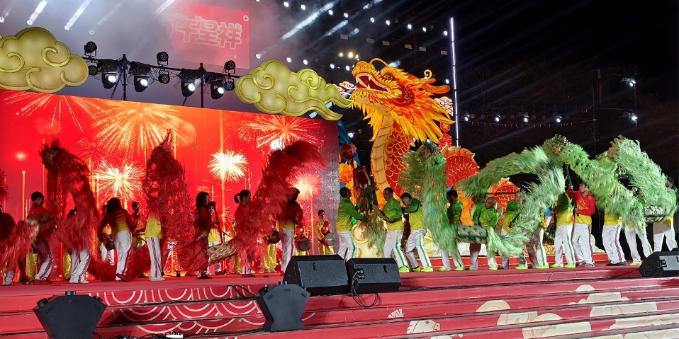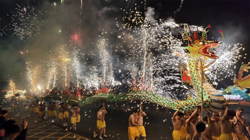 广场两侧,春节圩市热闹非凡,客家腌面、酿豆腐等特色小吃香气四溢,客家手工艺品、新春年货琳琅满目,市民游客逛吃购娱一站式体验,在烟火气中感受“客来是家人”的温馨与温暖。 夜耀梅江:非遗火龙铸传奇 夜幕降临,华灯初上,院士广场的“梅州女神”“龙马精神”等主题灯组次第绽放,与市民手中的马年主题灯笼交相辉映,勾勒出一幅璀璨的客家新春画卷。19时45分,“祥龙献瑞·福满客都”贺新春文艺演出正式开演,为现场观众带来了一场视听享受。 ![]() 大埔“花环龙”柔美灵动,客家山歌悠扬婉转,广东汉剧选段韵味悠长……一系列极具客家特色的非遗节目轮番上演,赢得满堂喝彩。 20时45分,活动迎来最高潮——国家级非物质文化遗产丰顺埔寨“烧火龙”震撼登场。在震天的锣鼓声中,数十名赤膊大汉手擎40多米长的火龙,在绣球的引领下绕场三周,寓意“金龙出洞”。随着长者点燃引线,火龙瞬间被璀璨的火花包裹,赤膊汉子们挥舞着火龙,在火海中穿梭、腾跃、翻滚,火龙张嘴、吐珠、躬身、摇尾,每一个动作都刚劲有力,气势磅礴。