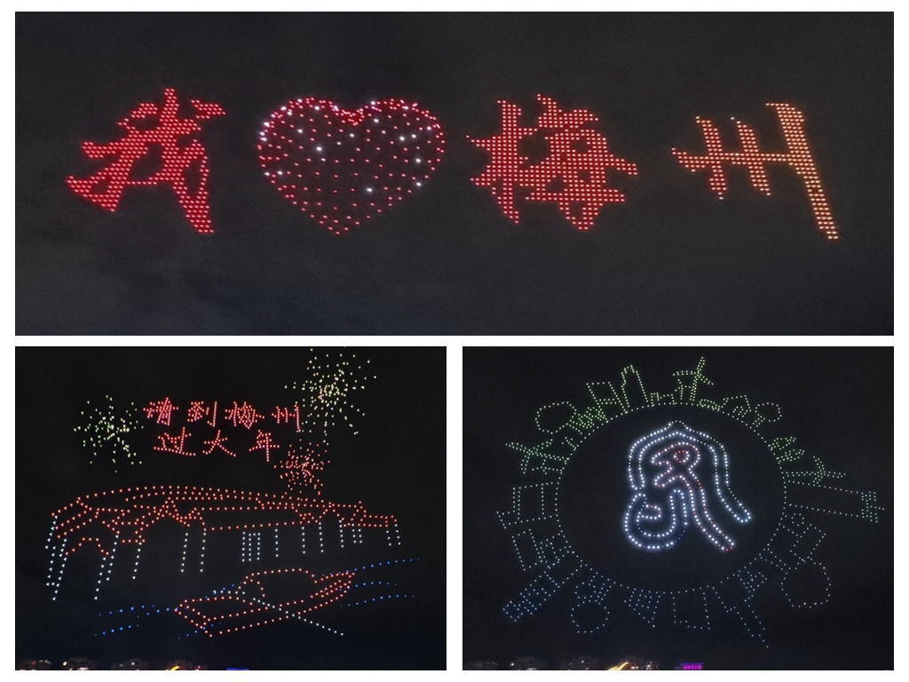 漫天火花如流星坠落,映照在现场观众激动的脸庞上。按照客家民俗,被火花烫出“泡”,寓意着今年“发大财”,这份独有的祈福方式,让现场氛围更加热烈。熊熊火光中,客家人奋勇争先、团结拼搏的精神特质展现得淋漓尽致。 天绘锦绣:科技光影贺马年 烧火龙表演结束后,21时整,数百架无人机腾空而起,在夜空中迅速集结,开启了一场精彩绝伦的光影秀。无人机编队不断变换造型,从“新年快乐”“福满客都”等新春祝福,到兴宁花灯、客家围龙屋等客家文化符号,再到“万马奔腾”的马年主题图案,一幅幅精美的画面在天幕上徐徐展开,将传统客家文化与现代科技完美融合,引发现场观众阵阵惊叹。
