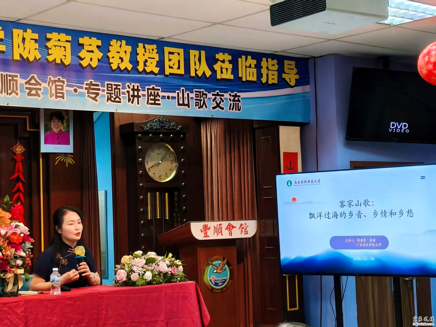 客家网 新加坡讯 2026年2月4日立春日,新加坡丰顺会馆暖意融融、歌声悠扬,来自当地10家客属会馆的乡贤乡亲齐聚一堂,与广东技术师范大学陈菊芬教授(菊子老师)共赴一场客家山歌的文化之约。专题讲座与山歌交流晚会同步启幕,经典旋律与南洋原创交织,乡音乡情在狮城绽放别样光彩,为海外客家人送上一份独特的立春文化厚礼。