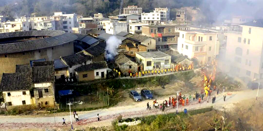 古村盛事:行香叩许,一场刻进血脉的客家祈福 天刚微亮,花萼楼周边便已热闹起来,年味在锣鼓声与鞭炮声中愈发浓郁。上午8时许,一场庄重的祈福仪式正式拉开帷幕:身穿客家传统服饰的男性长辈领衔,彩旗手、锣鼓手列队相随,抬着神像轿子的村民步伐稳健,一支颇具规模的游行队伍从花萼楼出发,沿着村道游走全村,开启经典的“行香”仪式。 游行队伍所到之处,鞭炮齐鸣震天响,沿途村民纷纷走出家门,手持香火虔诚鞠躬献香,眼神里满是对新年的期盼。袅袅青烟中,客家儿女对美好生活的向往,随香火一同升腾。行香仪式结束后,全村老少与远道而来的游客一同跟随队伍返回花萼楼,迎来整场祈福活动的核心环节——“叩许”。
