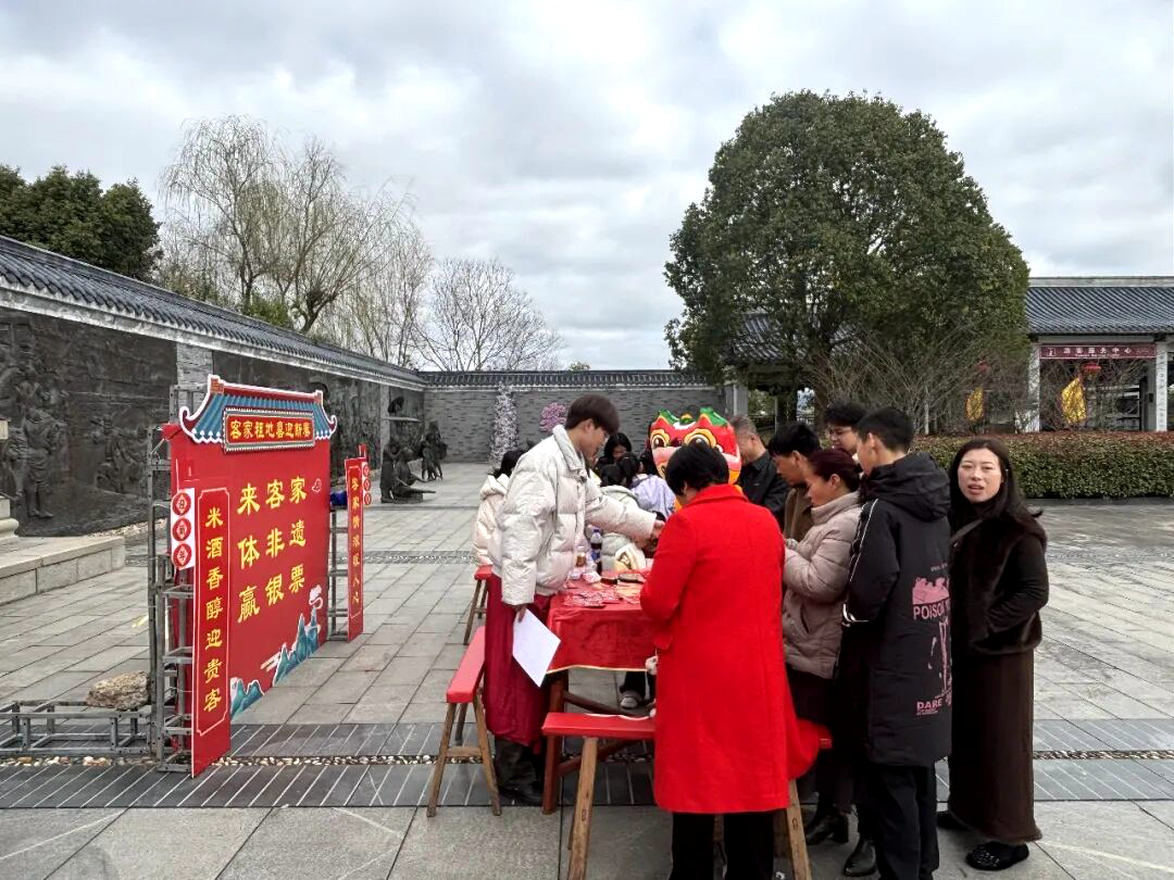 米酒迎宾,味觉里的客家温情 “客家米酒飘香迎宾”活动成为游客抵达后的第一抹暖意。酿酒师傅现场展示传统酿造技艺,游客举杯共品醇酿,清甜酒香伴随笑语回荡。不少家庭游客表示,这杯地道的客家米酒,喝下的是年味,品出的是围龙屋里的待客之道。