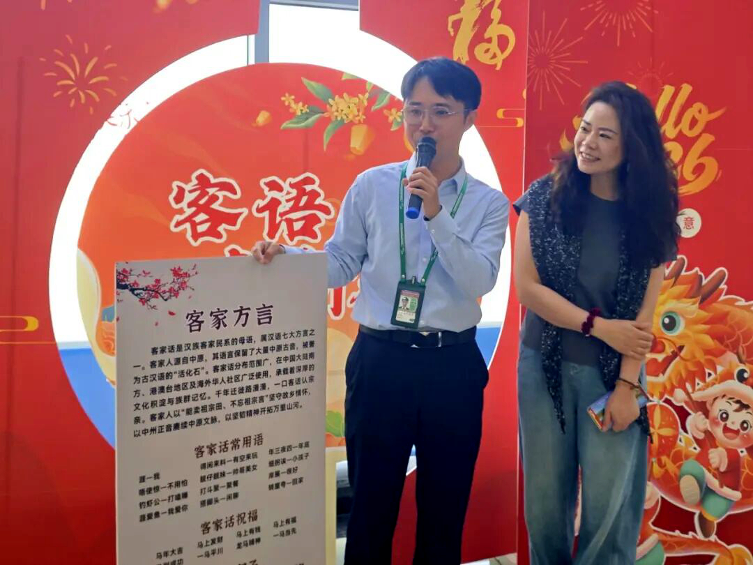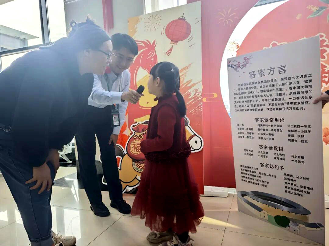 活化石传情,客语里藏着客家根与魂 客家话是汉族客家民系的母语,属汉语七大方言之一,因保留了大量中原古音,被学界誉为古汉语的“活化石”。千百年间,客家人历经数次大迁徙,却始终坚守“能卖祖宗田、不忘祖宗言”的信念,让客家话在中国大陆南方、港澳台地区及海外华人社区代代相传,成为承载客家文化积淀与族群记忆的重要载体。 活动现场,机场工作人员整理的客家话常用语与专属祝福语,让旅客直观感受客语的趣味与底蕴。“年三夜四”道尽年末的时光韵味,“细拐诶”唤出对孩子的亲切称呼,“转屋夸”藏着客家人对回家的期盼;而“马到成功”“马上有钱”“龙马精神”“一马当先”等马年专属客语祝福,更是将客家话与新春年味完美融合,既贴合2026丙午马年的节日氛围,又让客语表达更具时代新意。