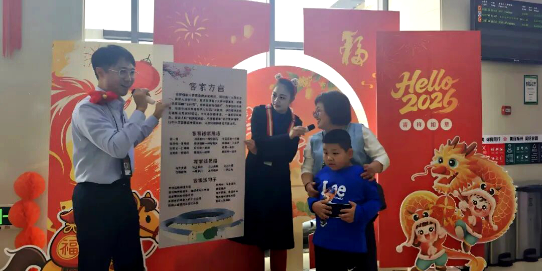 客音开唱,航站楼里掀起客家话学习潮 活动伊始,梅州机场地勤服务部工作人员以一首客家话通俗歌曲《客家人系有料》点燃现场氛围,“涯系爱大声笑,系好开心值得自豪,客家人系有料,石牯来变金条”,质朴又豪迈的客语歌词,瞬间让航站楼充满浓郁的客家年味。 随后,机场“客享飞”服务员化身“客家文化推广大使”,手持设计精巧的“趣味客家话”教学手举牌,主动向过往旅客走近,一边讲解客家话的文化背景,一边手把手教授客家话通俗用语与新春祝福语。“我叫涯”“有空来玩叫得闲来料”“打瞌睡叫钓虾公”“梅州系展,欢迎来料”,一个个生动有趣的客语表达,搭配工作人员耐心的发音指导,让原本生涩拗口的客家话变得鲜活易懂。 不少旅客带着孩子围拢过来,饶有兴致地跟着一字一句模仿,从发音生疏到有模有样,稚嫩的童声与地道的客语交织,航站楼里满是欢声笑语。简单的几句客家话,不仅拉近了旅客之间的距离,更让大家在互动中感受到客家语言的独特魅力。