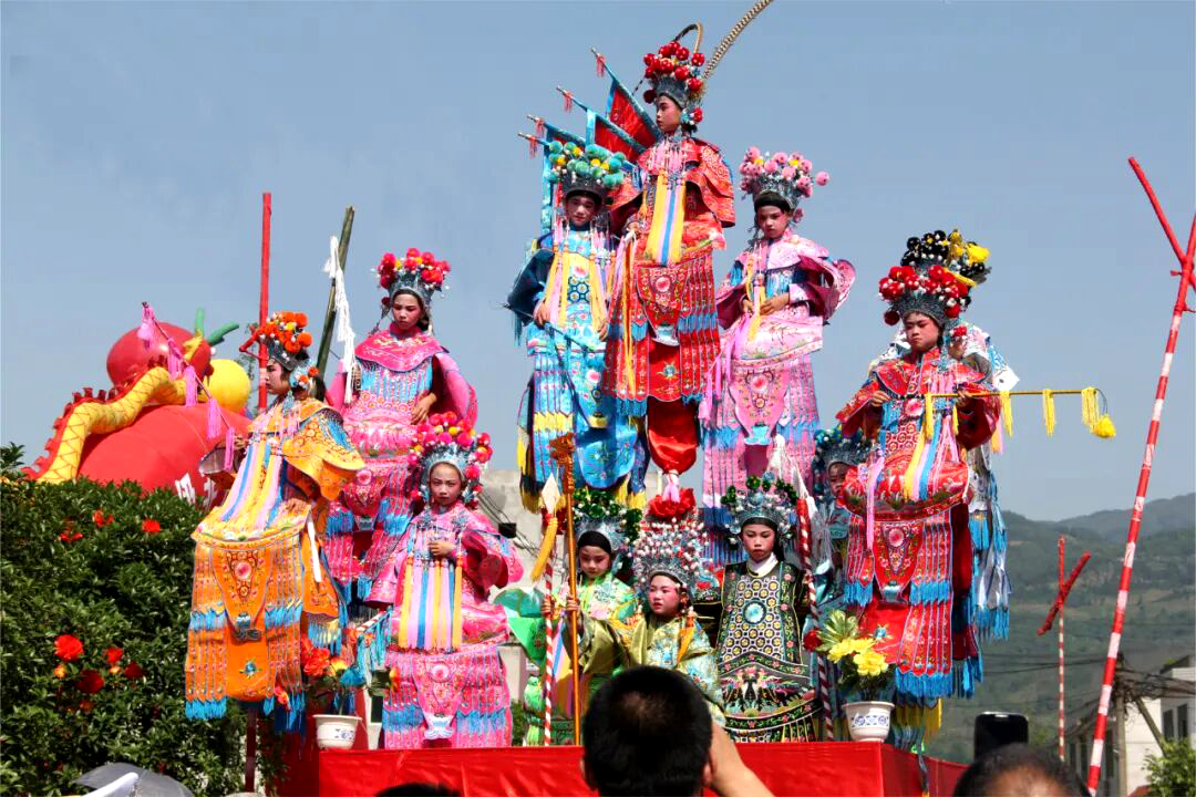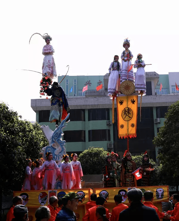 奇:核心在 “掩头” 与 “假脚” 的视觉魔术,铁桩支撑被巧妙伪装,孩童似凌空立于伞尖、酒壶之上,这门口传心授的绝技,是客家工匠的巧思结晶。 险:四至六米高的铁桩上,孩童身姿轻盈,看似惊险却暗藏乾坤,宽布带牢固绑定、壮汉持叉护卫,“稳中求险” 恰似客家人迁徙扎根的坚韧。 雅:每架高装都是一出川剧名段,《白蛇传》《穆桂英挂帅》轮番上演,既守客家祈福崇文的根,又融川剧艺术的韵,雅俗共赏。 美:蜀绣戏服金丝银线绣花鸟,锣鼓唢呐奏响客家豪情,十六名壮汉抬台、龙灯狮舞相伴,巡游队伍绘就流动的民俗画卷。 这门融合木工、铁艺、戏剧、力学的综合艺术,是客家集体智慧的结晶,更是最具视觉冲击力的客家文化符号。