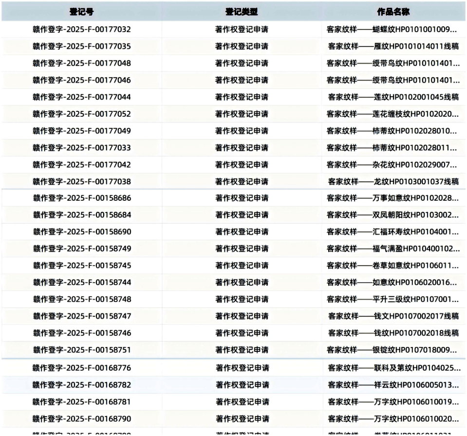 文化“基因解码” 在赣州市客家文化遗产研究院的档案库里,时间仿佛被重新雕刻。过去1年多,研究院的“客家纹样数字化再生工程”系统采集了超过3000件客家纹样,其中1800余件已完成版权登记。这些曾散落于民居雕刻、服饰刺绣与日用器皿上的图案,如今以数字化的形态,获得了第二次生命。