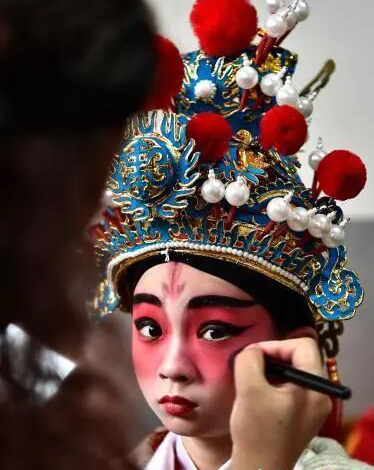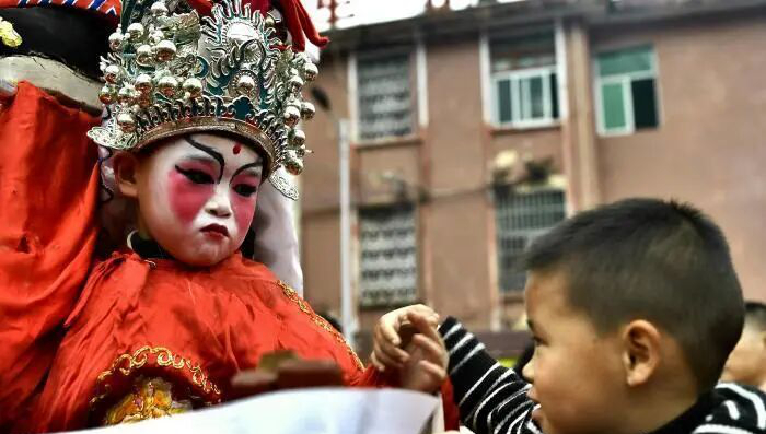匠心装扮,祖训融于民俗细节 走古事的精彩,藏在每一处细节里。活动前,村民们为参与孩童精心化妆、穿戴戏袍,勾画戏曲脸谱,尽显客家民俗的独特韵味。七棚古事各设两名男童扮天官、武将,且按罗氏“忠、义、仁、智、信、礼、和”祖训排序,让客家文化与祖训家规在民俗中代代传。![参加“走古事”的小孩在化妆]