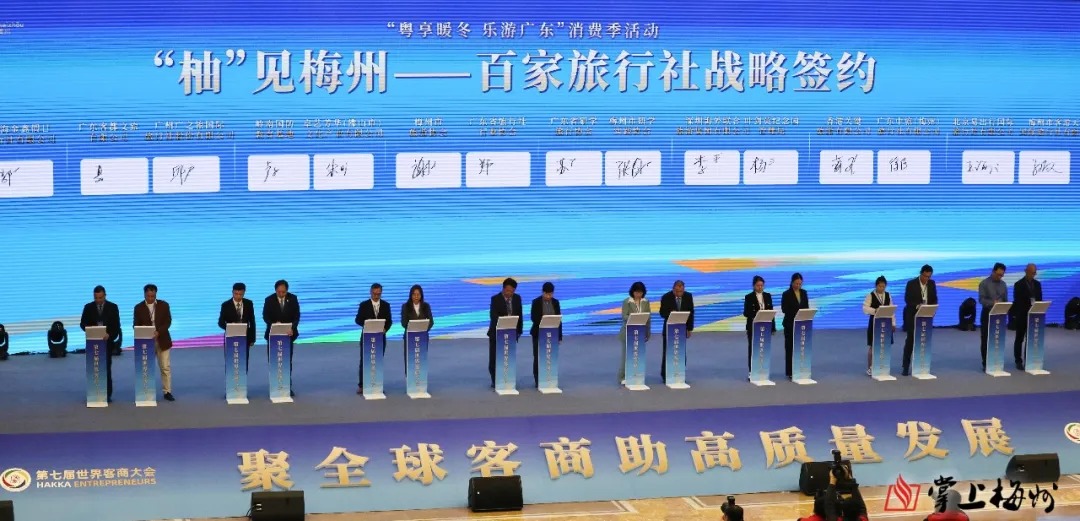 第七届世界客商大会期间举行“柚”见梅州——百家旅行社战略签约活动 (掌上梅州资料图片) 2023年11月24日,第七届世界客商大会在广东梅州举行,来自全球38个国家和地区的客商代表及领导嘉宾共约1200人参会。第七届世界客商大会以“聚全球客商助高质量发展”为主题,由广东省人民政府主办,梅州市人民政府和广东省商务厅承办。开幕式前举行了客家非遗展演和“同心聚焰·薪火相传”主火炬点火仪式。 此次大会秉持“开放、创新、合作、共赢”的理念,大会期间进行了广东省客属地区(韶关、河源、惠州、清远、梅州)5市的招商推介,举行了客属地区重大项目集中动工、投产仪式,并开展“柚”见梅州——百家旅行社战略签约等活动,有力推动招商引资与项目落地。大会还举办了全球客商与人力资源产业融合发展交流会、青年客商对话会等系列专题交流活动,以及“客家杯”国际足球赛等文体联谊活动,旨在汇聚全球客商资源,推介梅州“苏区+湾区”叠加政策优势,为梅州加快振兴、助力广东高质量发展注入新动能。 |
