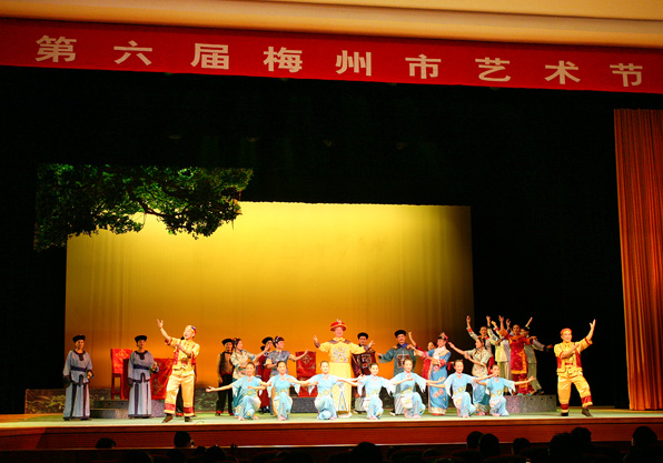 五华采茶戏山区人们喜爱看,珠三角人们一样喜爱看。图为五华采茶戏在广州番禺社区的精彩表演得到广大观众的热情欢迎(摄影:吴耀东) 源流与演变:从赣南“三脚戏”到客家“大戏” 五华采茶戏的历史,是一部生动的客家文化迁移与融合史。它的根,在江西省赣州的九龙山。大约两百多年前,这种最初仅由一两个角色(一旦一丑或二旦一丑)表演的“三脚戏”,随着客家人的迁徙脚步或商路往来,传入五华。最初的形态简单质朴,贴近山野茶农的日常生活。传入五华后,本地老艺人们没有简单照搬,而是将其与本地客家民间艺术、生活风情深度融合,不断开掘。角色行当从简单变得齐全,发展出生、旦、净、末、丑;表演程式也日益丰富,形成了以独特的“步子、袖子、扇子”和“小旦的手巾花”为核心的表演风格,完成了从民间小戏到舞台“大戏”的华丽蜕变,最终定型为独具特色的“粤东采茶戏”。 艺术特色:客家话唱出的生活喜剧 五华采茶戏的魅力,首先在于其深入骨髓的“客家性”。 语言之魂:其所有唱词与念白,均使用纯正的客家话,乡音浓郁,通俗易懂,让本地观众毫无隔阂,倍感亲切。这是它区别于其他剧种、扎根客家群众的最核心标识。 音乐之韵:音乐唱腔在传统板腔体基础上,大胆吸收时代音调,并创造性地以高音二胡为主奏乐器,配以扬琴、琵琶、笛子等民族乐器,甚至适当融入西洋乐器,形成了特色鲜明的伴奏体系。打击乐部分也采用了创新的锣鼓经,节奏丰富。 表演之形:表演上载歌载舞,诙谐逗趣。尤其以小丑的“矮子步”、小丑与小生的“扇子功”、小旦的“手巾花”最为精彩,生活气息极浓。同时,它也借鉴了花朝戏、山歌剧等姊妹艺术的表现手法,形成了活泼、朴实、热烈的舞台风貌。