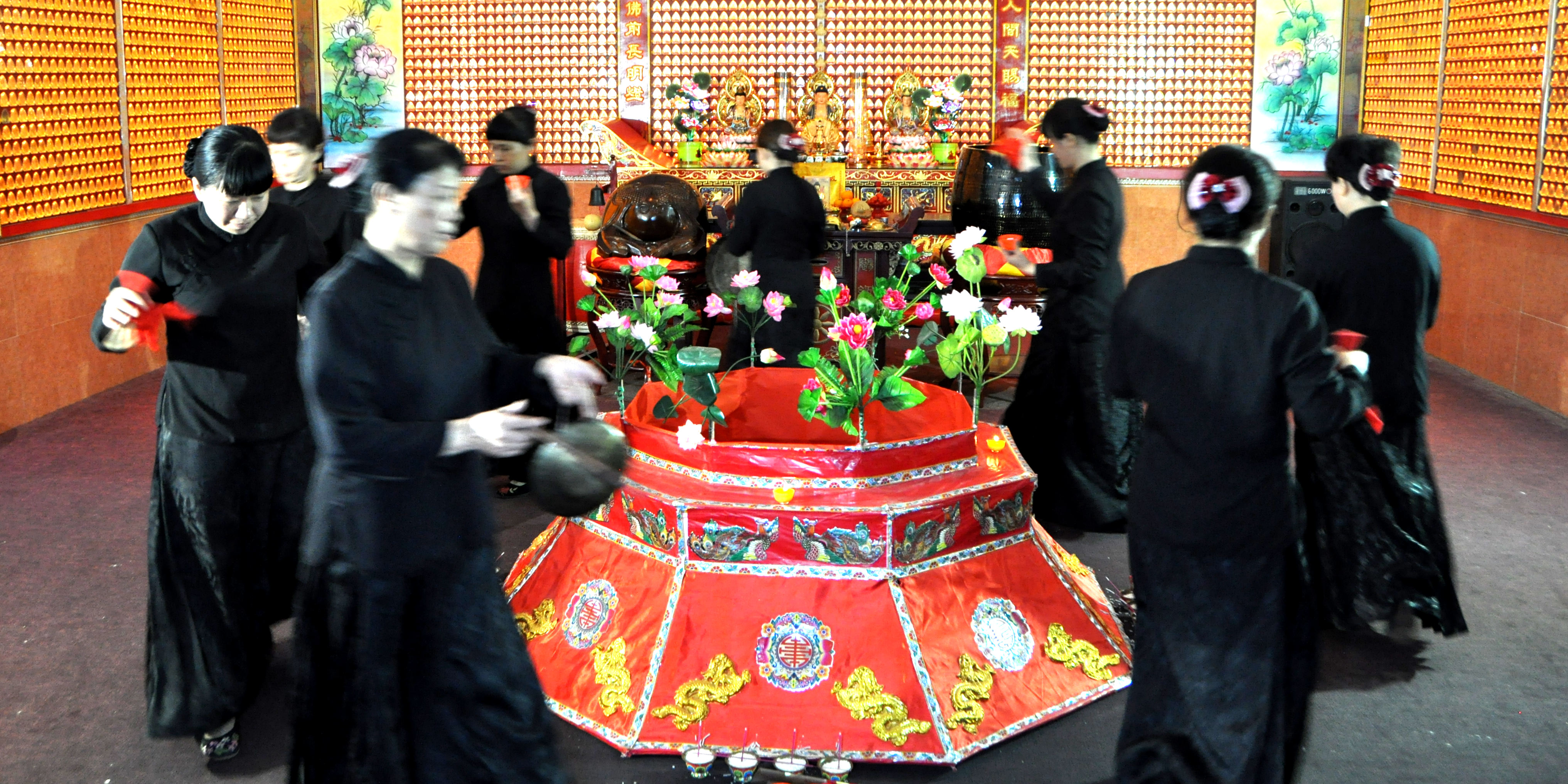 形制:灵堂前的庄严仪轨与独特技艺 传统的“打莲池”是一场严谨而完整的仪式性表演。其程序繁复,多达十余个环节,从“告佛”、“行三途”启始,历经“双龙出洞”、“打三宝”、“请十方”,至“莲池海会”结束,结构完整,充满象征意义。 表演规模灵活,从3人的“单莲池”、4人的“双莲池”,到8人的“八角莲池”,最多可至24人,形成丰富的队形变化。表演者均为女性(斋嫲),身着统一的黑色大襟衫与黑长裙,庄重肃穆。她们手持关键法器——莲池杖(象征目连的锡杖),以及珠杯、小锣、小钹等乐器,边舞边吟唱经文。 其舞蹈动作细腻,尤以“滚杖花”、“滚腕花”、“跪地盘腕花”等为特色,在方寸灵堂之间,舞步轻盈而克制。音乐原本依托于佛曲,采用流水板、短七字板、禅板等多种板式,唱腔低沉哀切,与超度场合的氛围融为一体,形成了极具辨识度的艺术风格。