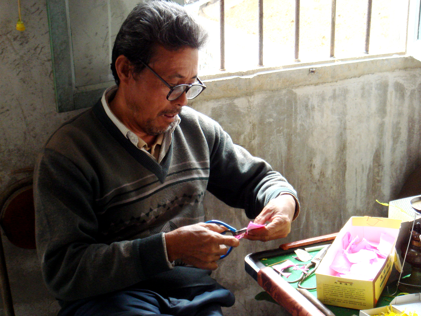 二、足可乱真的纸上生花工艺 埔寨纸花的魅力,首先在于其极致的仿真工艺。其品种繁多,涵盖牡丹、兰花、玫瑰、菊花、古榕等40余种,甚至连花盆都以纸制成,整体栩栩如生。制作用料极为考究,花瓣需采用台湾特产的通草纸,辅以上乘颜料,并搭配宣纸、丝绸、好蜡、松香等材料。工艺精细复杂,耗费工时,每一朵纸花都凝聚着艺人对自然之美的细致观察与手上功夫。