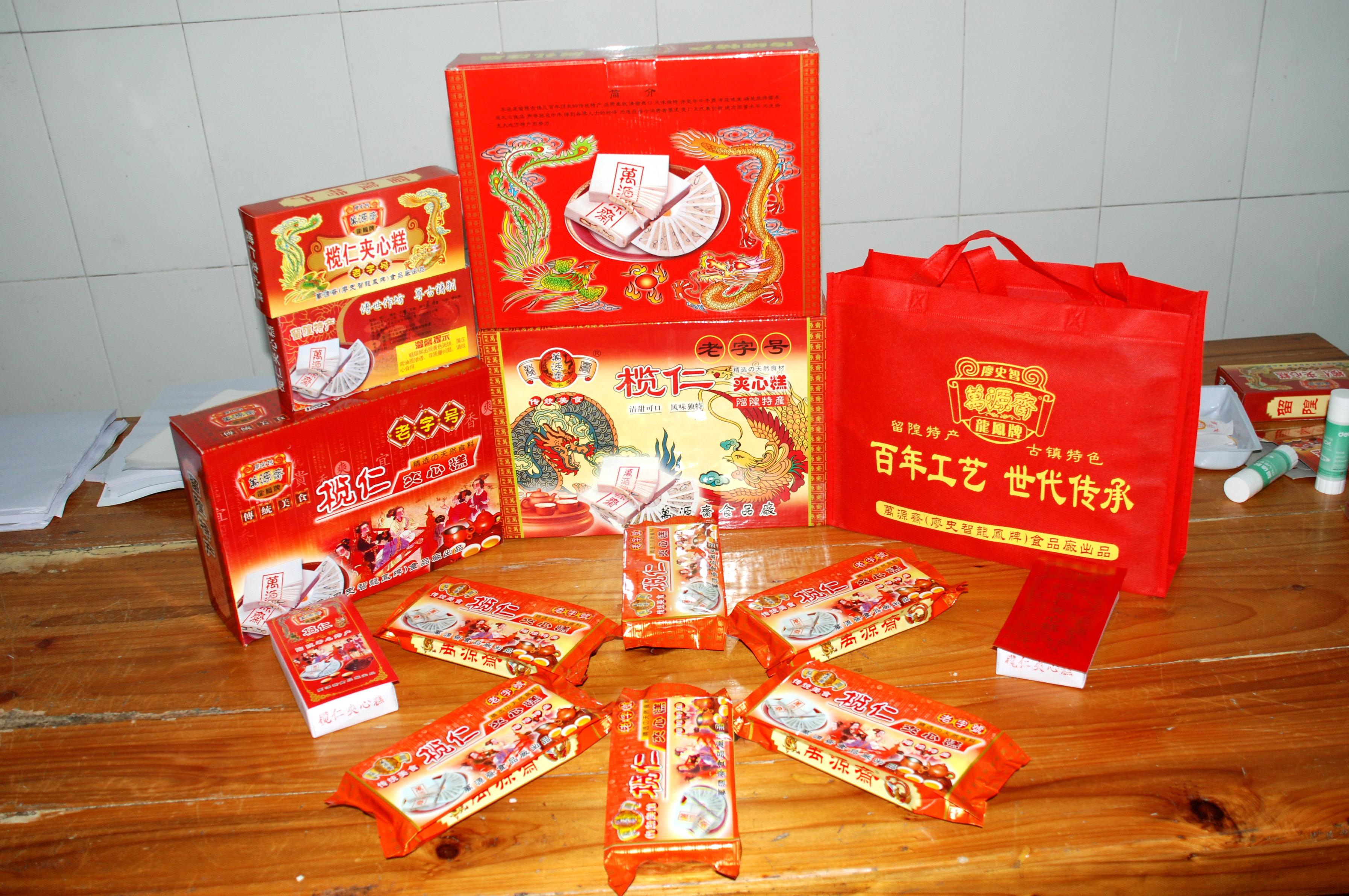 工艺:粉糖间的匠心与“可燃烧”的奥秘 留隍云片糕,又称“夹心糕”,其制作工序看似不繁,实则极为考究。据“万源斋”传人介绍,关键在于糯米粉与糖的精确配比。正宗的云片糕质地极为干燥酥松,甚至“能着火燃烧”,这正是其高品质与独特工艺的标志。主要原料选用优质糯米、白糖、芝麻油,辅以橙糖、杏仁、瓜仁、榄仁、阿华田等多种辅料。原料经过精细加工,制成的成品呈长方形(约15cm7cm4cm),可轻易剥成均匀的薄片,因而得名“云片糕”。其装潢典雅,常印有“双喜”、“龙凤呈祥”等传统吉祥图案,是婚庆、乔迁等喜事中不可或缺的礼品,寓意“高升、好运”。 传播:从韩江之畔到南洋各地的“乡情信物” 留隍镇地处丰顺县东南,韩江中下游,毗邻潮汕,地理位置独特。这使得留隍云片糕不仅深受本地及周边客家、潮汕民众喜爱,更随着历史上客家人“下南洋”等迁徙足迹,远销至全国各省市、港澳地区及东南亚一带。对于漂泊在外的游子而言,一盒印着吉祥纹样的云片糕,不仅是解馋的家乡味,更是慰藉乡愁、联络同乡情谊的“文化信物”。它跨越山海,将“步步高升”的美好祝福,从客都梅州带往世界各地。