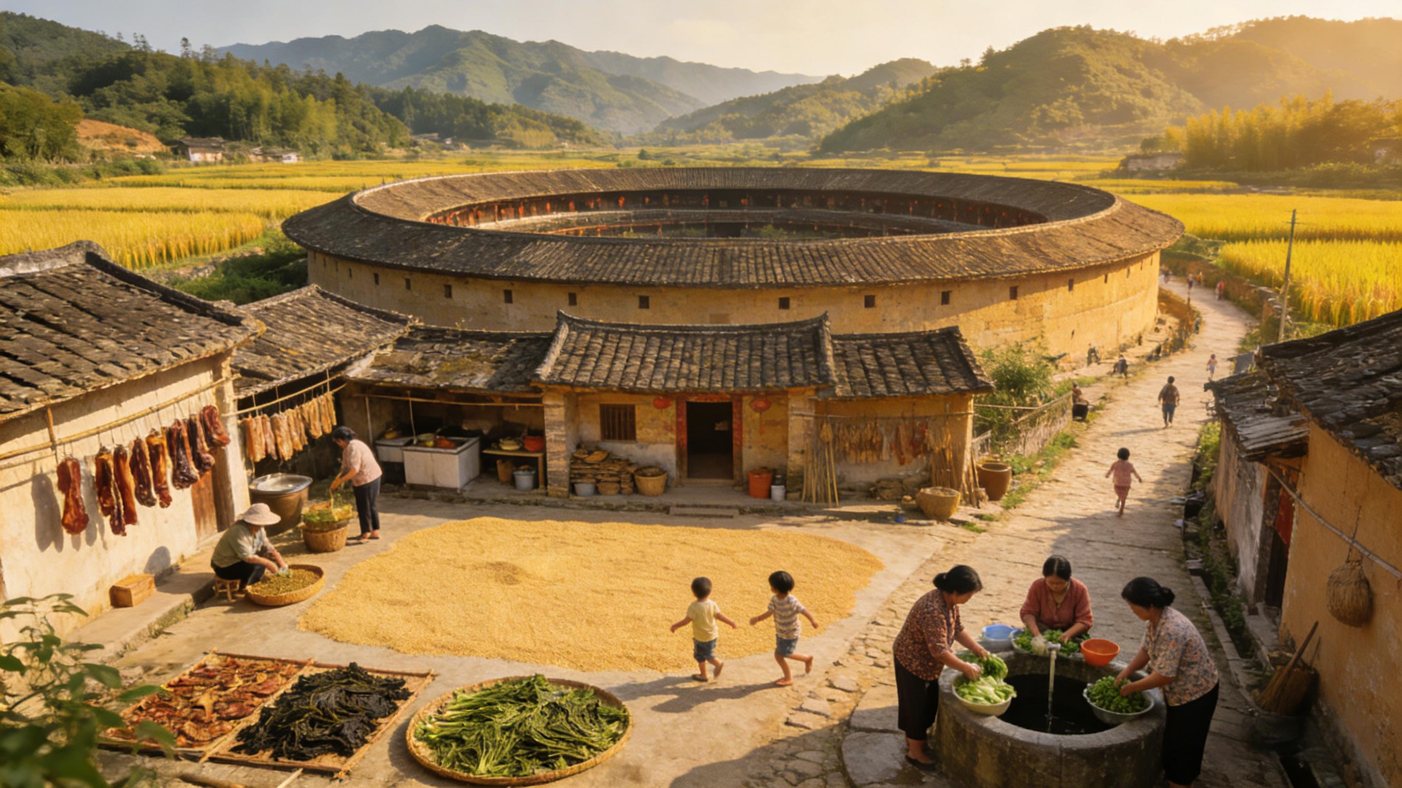 筑居立根:围龙土楼,凝宗族守家园 在贫瘠的南方山区,客家人以“耕读传家”为信条,在开荒拓土的同时,更用智慧筑起了属于自己的精神堡垒——围龙屋与土楼。 客家民居是中原建筑文化与南方山区生活的完美融合,围龙屋多依山而建,前有半月形池塘,后有弧形围屋,整体呈太极图布局,藏着“山环水抱,藏风聚气”的风水智慧;福建土楼则以生土夯筑,墙厚可达1米,高逾15米,按八卦布局排列,兼具居住与防御功能。这些建筑皆以“聚族群居”为核心,少则数十间房,多则上百户人家共居一处,底层作厨房仓库,上层为卧室,炮楼、瞭望孔等设计,让其成为固若金汤的“城堡”。 围龙屋与土楼,从来都不只是简单的栖身之所。在动荡的岁月里,它们抵御外敌、守护宗族;在和平的时光中,它们凝聚亲情、传承家风。一砖一瓦间,皆是客家人“团结协作、自强不息”的精神写照,更是他们在异乡扎下根脉的最好证明。