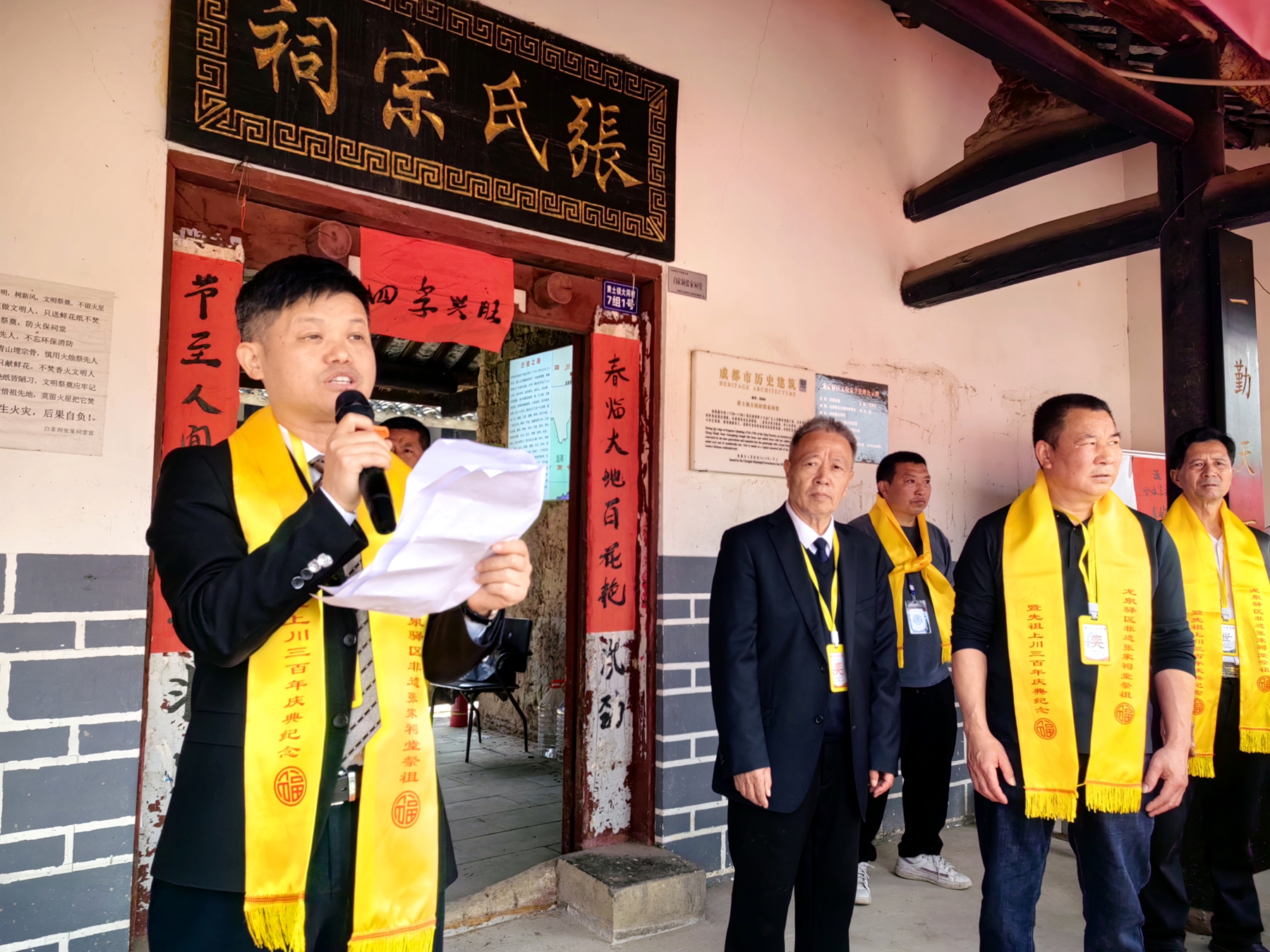 宗亲齐聚话桑梓,非遗礼制敬先祖 本次庆典依托张家祠堂这一承载客家记忆的历史古建筑开展,全程严格遵循龙泉驿区级非遗客家祭祖礼制,从祭典流程到礼仪细节,均原汁原味还原客家宗族祭祀的传统规范,让古朴的历史建筑与鲜活的非遗民俗交相辉映,尽显客家尊祖睦族的传统美德与文化底蕴。 四川省客家海外联谊会(下称“四川省客联”)常务副会长张新成、副会长张义文,常务理事张汉秋,副秘书长张清才受邀出席庆典,与来自各地的张氏客家宗亲齐聚祠堂,在庄严肃穆的祭祀仪式中,共同追忆粤东客家张氏先祖奉旨入川、跋山涉水扎根巴蜀的创业艰辛,细数三百年来张氏族人在龙泉驿繁衍生息、开枝散叶的发展历程,在焚香祈福、共叙情谊中,拉紧宗族血脉联结,厚植客家乡情底蕴。