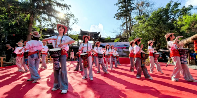 多元艺术展演:青春赋能古寨新韵 红山茶合唱团的悠扬和声、非洲鼓的奔放节奏、民族舞的翩跹姿态在山房水寨户外广场轮番上演。闽西职业技术学院学子将课堂移至山水之间,用现代艺术语言对话客家传统文化,现场观众随音乐节拍鼓掌应和,古老寨墙与年轻笑脸构成动人图景。
