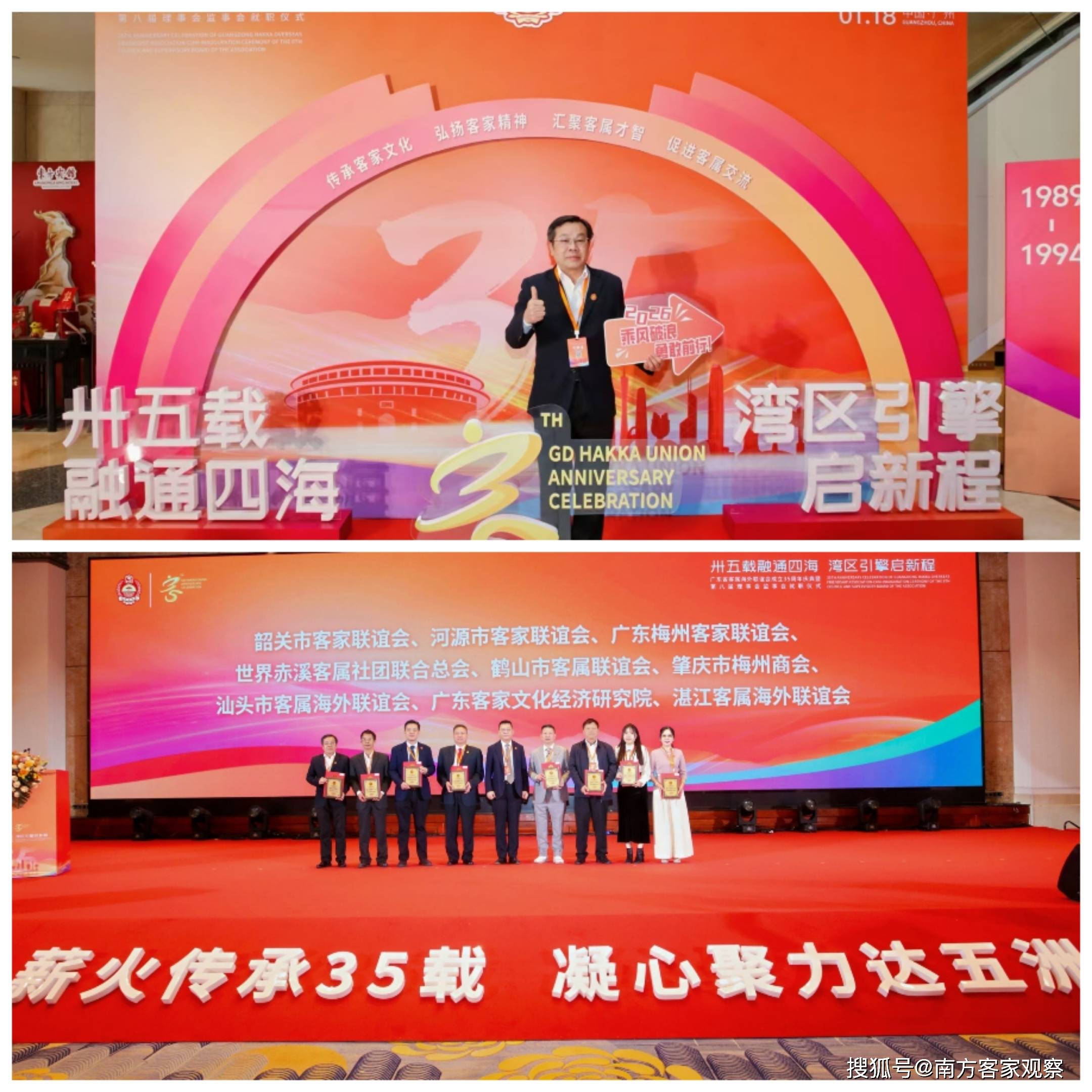 1月18日,广东省客属海外联谊会在广州东方宾馆隆重举行第八届理监事会就职典礼,同时庆祝其成立35周年。