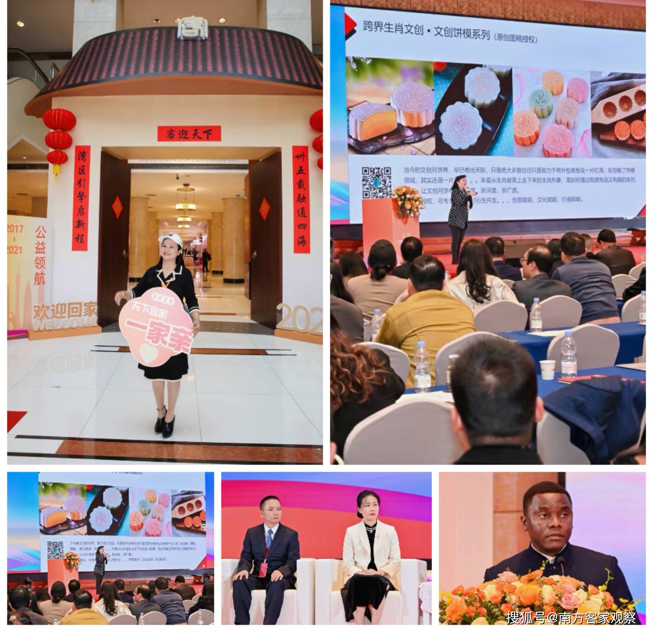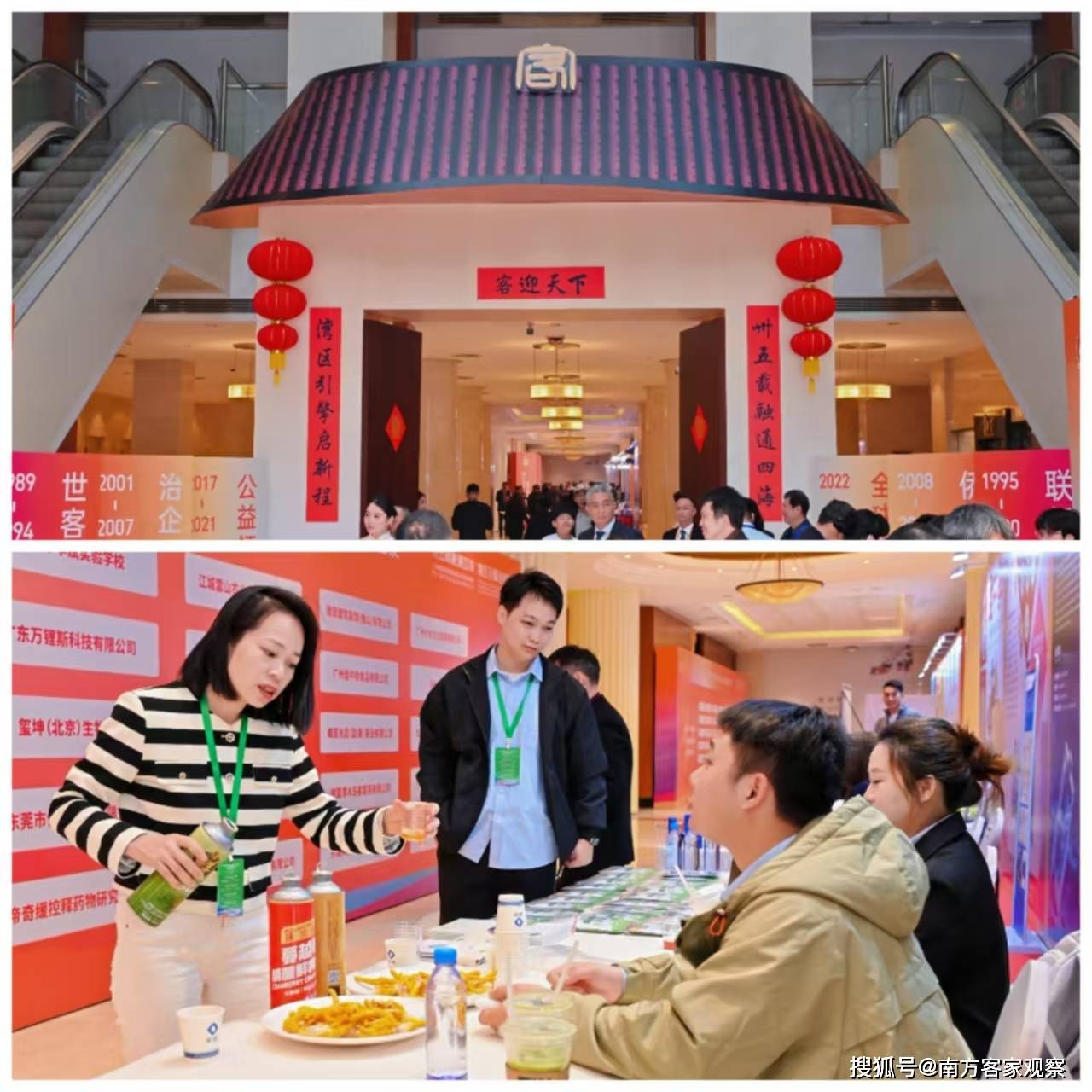 会场大厅外,客家元素尤为引人注目。客家围屋模型错落有致,展示了客家人独特的建筑风貌;桌上摆放的客家土特产琳琅满目,让人垂涎欲滴。巨大的牌匾上,“传承客家文化,弘扬客家精神,汇聚客属才智,促进客属交流”的标语格外醒目,彰显了客家人团结奋进的精神风貌。牌坊左右两侧则书写着“卅五载融通四海,湾区引擎启新程”,寓意着客家人将继续以开放包容的姿态,携手共创美好未来。